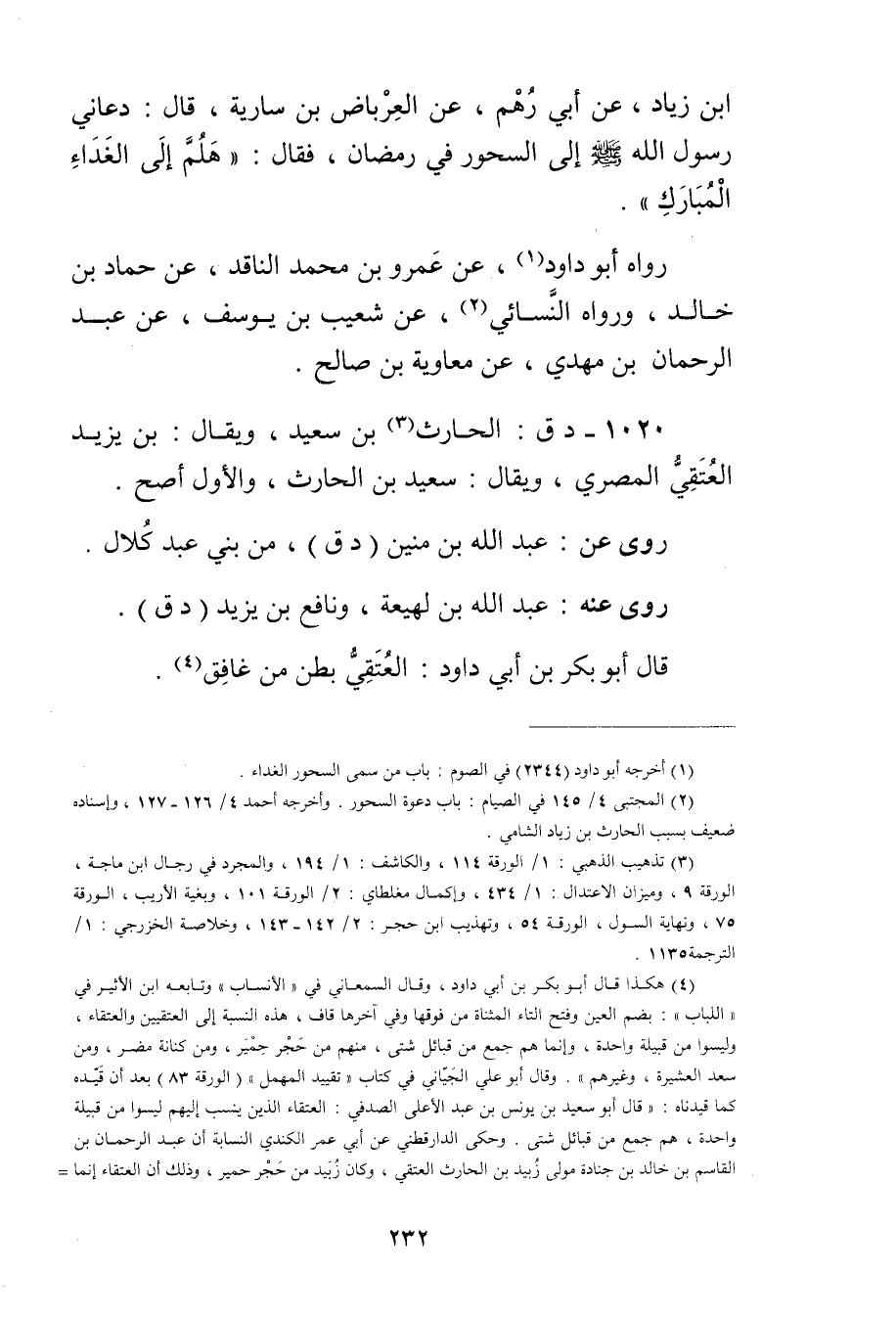(4) هكذا قال أبو بكر بْن أَبي داود، وَقَال السمعاني في "الانساب"وتابعه ابن الاثير في "اللباب": بضم العين وفتح التاء المثناة من فوقها وفي آخرها قاف، هذه النسبة إلى العتقيين والعتقاء، وليسوا من قبيلة واحدة، وإنما هم جمع من قبائل شتى، منهم من حجر حمير، ومن كنانة مضر، ومن سعد العشيرة، وغيرهم". وَقَال أبو علي الجياني في كتاب"تقييد المهمل" (الورقة 83) بعد أن قيده كما قيدناه: قال أبو سَعِيد بن يونس بن عبد الاعلى الصدفي: العتقاء الذين ينسب إليهم ليسوا من قبيلة واحدة، هم جمع من قبائل شتى. وحكى الدارقطني عَن أبي عُمَر الكندي النسابة ان عبد الرحمن بن القاسم بن خالد بن جنادة مولى زبيد بن الحارث العتقي، وكان زبيد من حجر حمير، وذلك أن العتقاء إنما =