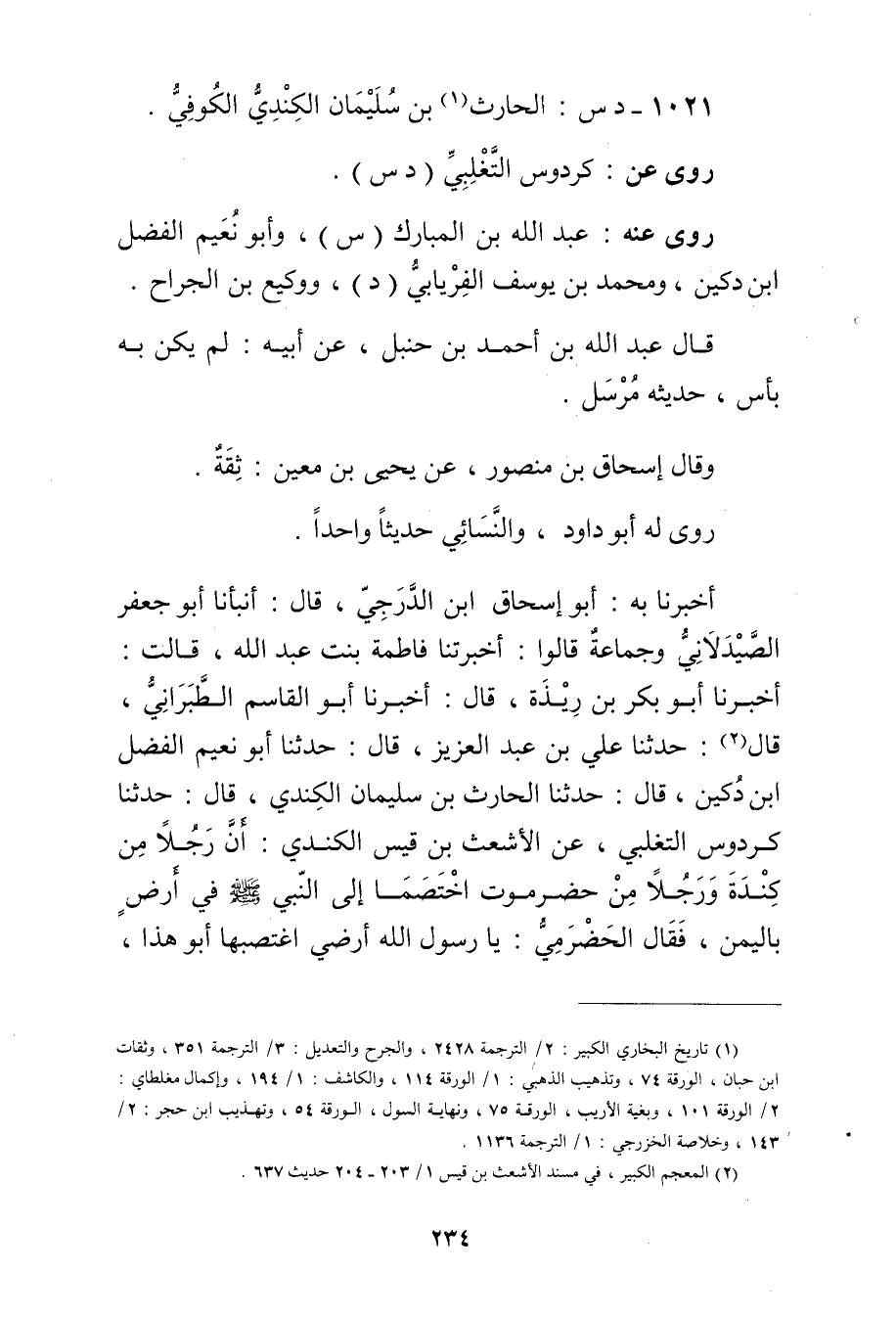 1021 د س: الحارث بن سُلَيْمان الكندي الكوفي (1) .