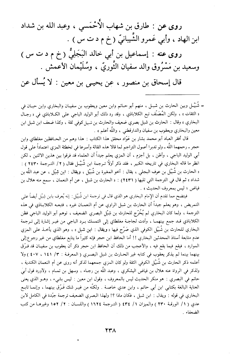 قال أفقر العباد أبو محمد بشار بن عواد محقق هذا الكتاب: هذا وهم من الحافظين مغلطاي وابن حجر رحمهما الله ولو تدبرا أصول التراجم لما قالا هذه القالة وأسرعا في تخطئة المزي اعتمادا على قول أبي الوليد الباجي، وأظن، بل أجزم، أن المزي يعلم جيدا أن العلماء قد فرقوا بين هذين الاثنين، لكن انظر ما قاله البخاري في تاريخه الكبير، فقد ذكر أولا ترجمة ابن شبيل فقال (2 / الترجمة 2430) : الحارث بن شبيل بن عوف البجلي، يقال: أخو المغيرة بن شبيل، ويُقال: ابن شبل، عن عَبد الله بن شداد"ثم قال في الترجمة التي تليها (2431) : الحارث بن شبل، عن أم النعمان، سمع منه هلال بن فياض، ليس بمعروف الحديث.