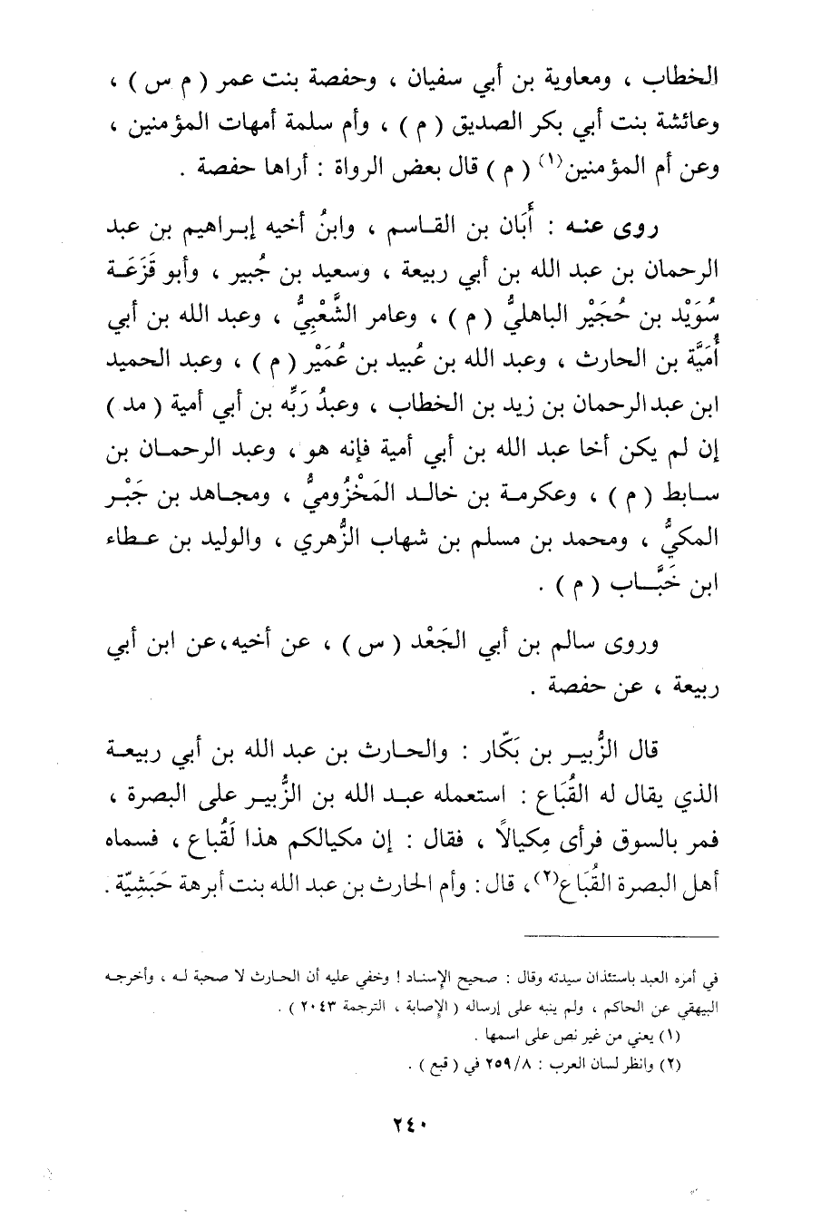 الخطاب، ومعاوية بْن أَبي سفيان، وحفصة بنت عُمَر (م س) ، وعائشة بنت أبي بكر الصديق (م) ، وأم سلمة أمهات المؤمنين، وعن أم المؤمنين (1) (م) قال بعض الرواة: أراها حفصة.