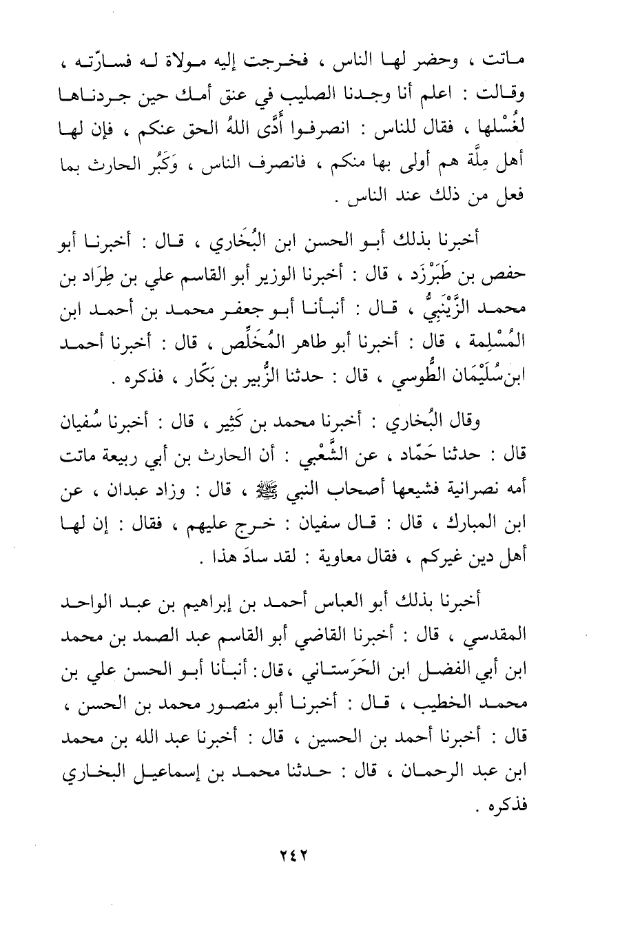 أَخْبَرَنَا بذلك أَبُو الْعَبَّاسِ أَحْمَدُ بْنُ إِبْرَاهِيمَ بْن عَبْد الواحد المقدسي، قال: أخبرنا الْقَاضِي أَبُو الْقَاسِمِ عَبْدُ الصمد بن محمد ابن أَبي الفضل ابْنُ الْحَرَسْتَانِيِّ، قال: أَنْبَأَنَا أَبُو الْحَسَنِ علي بْن مُحَمَّد الخطيب، قال: أَخْبَرَنَا أَبُو مَنْصُورٍ مُحَمَّدُ بْن الحسن، قال: أَخْبَرَنَا أَحْمَدُ بْنُ الحسين، قال: أَخْبَرَنَا عَبد الله بن محمد ابْنَ عَبْدِ الرَّحْمَنِ، قال: حَدَّثَنَا مُحَمَّدُ بْنُ إِسْمَاعِيلَ الْبُخَارِيُّ فَذَكَرَهُ.