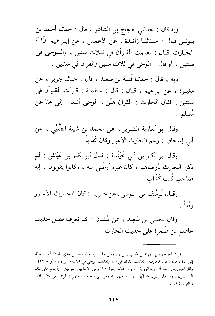 (1) شطح قلم ابن المهندس فكتب"بن". ومثل هذه الرواية أوردها ابن عدي بإسناد آخر، ساقه إلى مرة، قال: قال الحارث: تعلمت القرآن في سنة وتعلمت الوحي في ثلاث سنين (1 / الورقة 227) وَقَال الجوزجاني بعد أن أورد الرواية: وابن عباس يقول: لا وحي إلا ما بين اللوحين، وأجمع على ذلك المسلمون، وقد قال رَسُولُ اللَّهِ صَلَّى الله عليه وسلم: ستة لعنهم الله وكل نبي مجاب، منهم: الزائد في كتاب الله" (الترجمة 14) .
