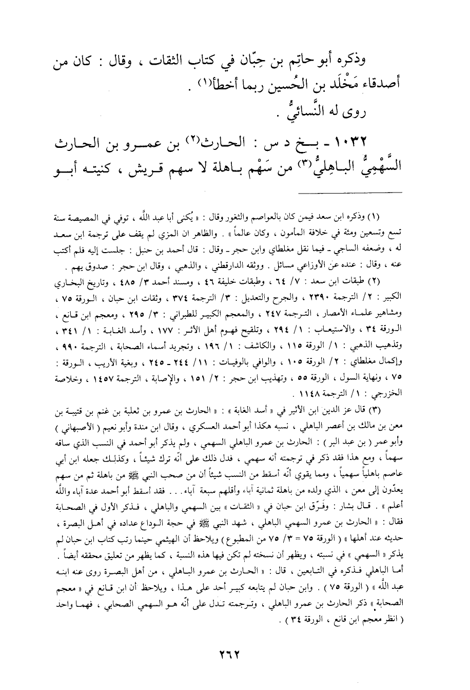 (3) قال عز الدين ابن الاثير في "أسد الغابة": الحارث بن عَمْرو بن ثعلبة بن غنم بن قتيبة بن معن بن مالك بن أعصر الباهلي، نسبه هكذا أبو أحمد العسكري، وَقَال ابن مندة وأبو نعيم (الاصبهاني) وأبو عُمَر (بن عَبد الْبَرِّ) : الحارث بن عَمْرو الباهلي السهمي، ولم يذكر أبو أحمد في النسب الذي ساقه سهما، ومع هذا فقد ذكر في ترجمته أنه سهمي، فدل ذلك على أنه ترك شيئا وكذلك جعله ابن أَبي عاصم باهليا سهميا، ومما يقوي أنه أسقط من النسب شيئا أن من صحب النبي صلى الله عليه وسلم من باهلة ثم من سهم يعدون إلى معن، الذي ولده من باهلة ثمانية آباء وأقلهم سبعة آباء..فقد أسقط أبو أحمد عدة آباء والله أعلم". قال بشار: وفرق ابن حبان في "الثقات" بين السهمي والباهلي، فذكر الاول في الصحابة فقال: الحارث بن عَمْرو السهمي الباهلي، شهد النبي صلى الله عليه وسلم في حجة الوداع عداده في أهل البصرة، حديثه عند أهلها" (الورقة 75 = 3 / 75 من المطبوع) ويلاحظ أن الهيثمي حينما رتب كتاب ابن حبان لم يذكر"السهمي"في نسبته، ويظهر أن نسخته لم تكن فيها هذه النسبة، كما يظهر من تعليق محققه أيضا. أما الباهلي فذكره في التابعين، قال: الحارث بن عَمْرو الباهلي، من أهل البصرة روى عنه ابنه عَبد الله" (الورقة 75) . وابن حبان لم يتابعه كبير أحد على هذا، ويلاحظ أن ابن قانع في "معجم الصحابة"ذكر الحارث بن عَمْرو الباهلي، وترجمته تدل على أنه هو السهمي الصحابي، فهما واحد (انظر معجم ابن قانع، الورقة 34) .