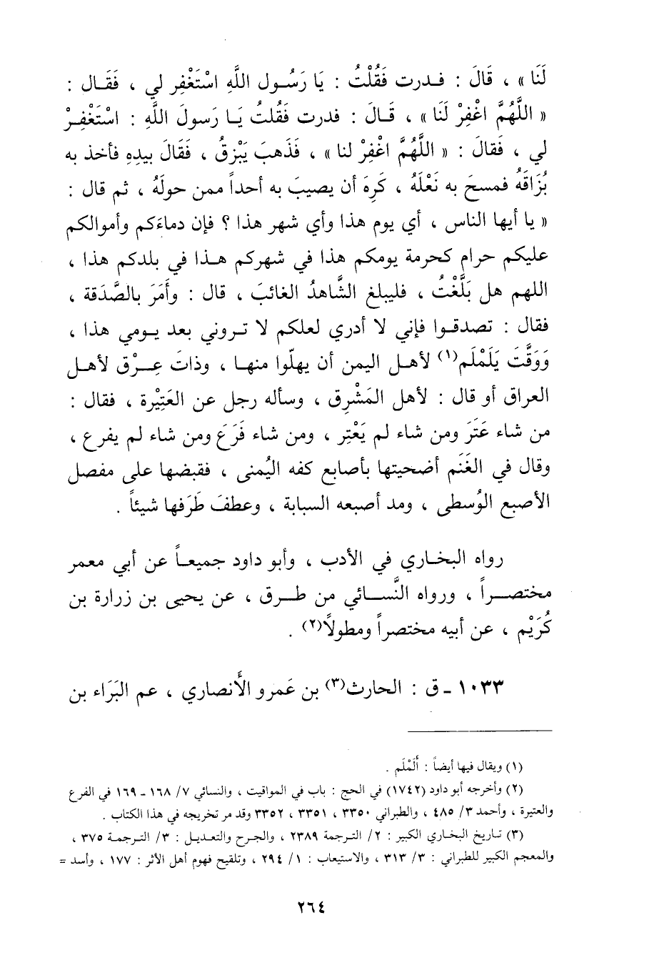 لَنَا"، قال: فَدُرْتُ فَقُلْتُ: يَا رَسُولَ اللَّهِ اسْتَغْفِرْ لِي، فَقَالَ: اللَّهُمَّ اغْفِرْ لَنَا"، قال: فَدُرْتُ فَقُلْتُ يَا رَسُولَ اللَّهِ: اسْتَغْفِرْ لِي، فَقَالَ: اللَّهُمَّ اغْفِرْ لَنَا"، فَذَهَبَ يَبْزُقُ، فَقَالَ بِيَدِهِ فَأَخَذَ بِهِ بُزَاقَهُ فَمَسَحَ بِهِ نَعْلَهُ، كَرِهَ أَنْ يُصِيبَ بِهِ أَحَدًا مِمَّنْ حَوْلَهُ، ثُمَّ قال: يَا أَيُّهَا النَّاسُ، أَيُّ يَوْمٍ هَذَا وأَيُّ شَهْرٍ هَذَا؟ فَإِنَّ دِمَاءَكُمْ وأَمْوَالَكُمْ عَلَيْكُمْ حَرَامٌ كَحُرْمَةِ يَوْمِكُمْ هَذَا فِي شَهْرِكُمْ هَذَا فِي بَلَدِكُمْ هَذَا، اللَّهُمَّ هَلْ بَلَّغْتُ، فَلْيُبَلِّغِ الشَّاهِدُ الْغَائِبَ، قال: وأَمَرَ بالصدقة، فقال: تصدقوا فإني لاأدري لَعَلَّكُمْ لا تَرُونِي بَعْدَ يَوْمِي هَذَا، ووَقَّتَ يَلَمْلَمَ (1) لأَهْلِ الْيَمَنِ أَنْ يُهِلُّوا مِنْهَا، وذَاتَ عِرْق لأَهْلِ الْعِرَاقِ أَوْ قال: لأَهْلِ الْمَشْرِقِ، وسَأَلَهُ رَجُلٌ عَنِ الْعَتِيرَةِ، فَقَالَ: مَنْ شَاءَ عَتَرَ ومَنْ شَاءَ لَمْ يَعْتِرْ، ومَنْ شَاءَ فَرَعَ ومَنْ شَاءَ لَمْ يَفْرَعْ، وَقَال فِي الْغَنَمِ أُضْحِيَتُهَا بِأَصَابِعِ كَفِّهِ الْيُمْنَى، فَقَبَضَهَا عَلَى مِفْصَلِ الأُصْبُعِ الْوُسْطَى، ومَدَّ أُصْبَعَهُ السَّبَّابَةَ، وعَطَفَ طَرَفَهَا شَيْئًا.