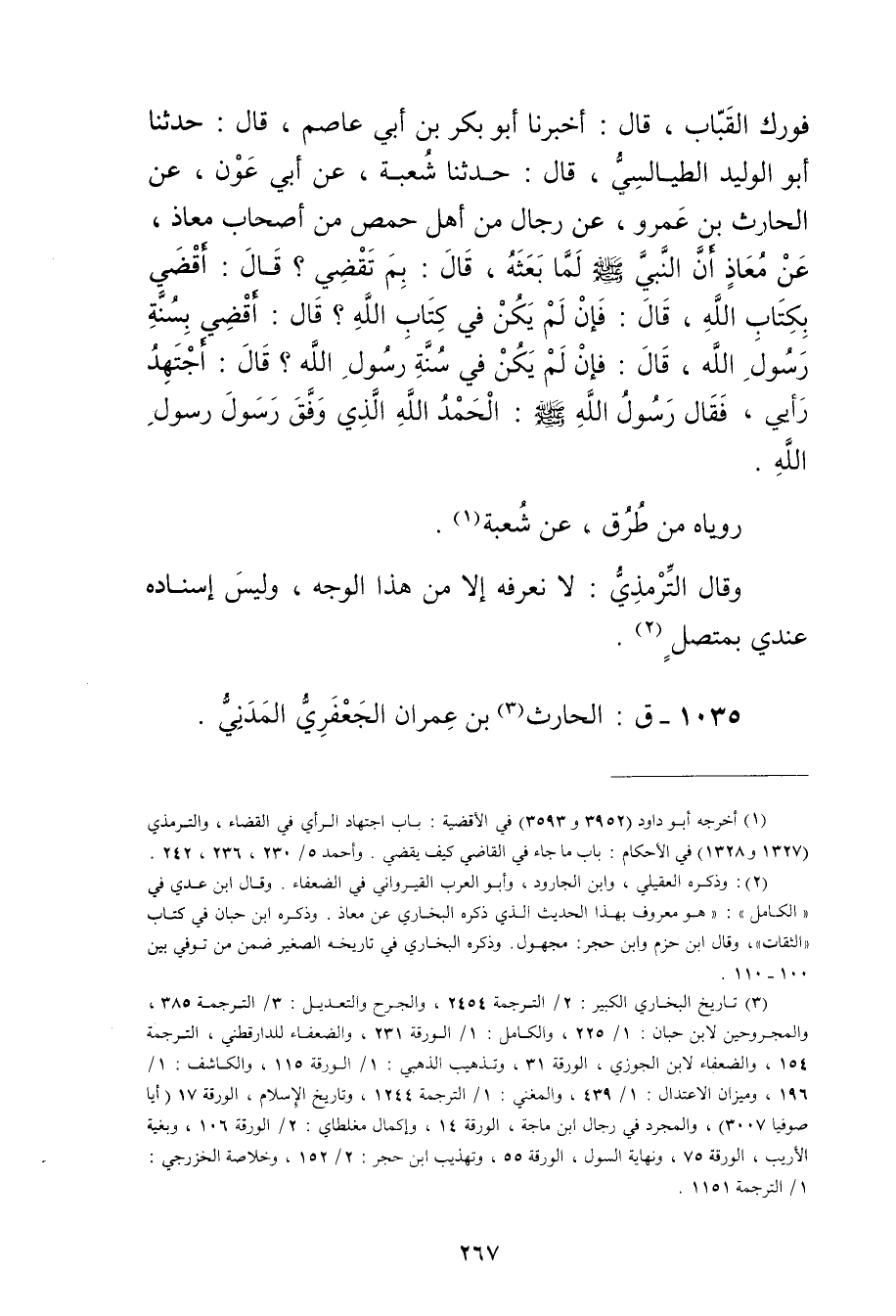 (1) أخرجه أبو داود (3952 و3593) في الاقضية: باب اجتهاد الرأي في القضاء، والتِّرْمِذِيّ (1327 و1328) في الاحكام: باب ما جاء في القاضي كيف يقضي. وأحمد 5 / 230 و236، 242.