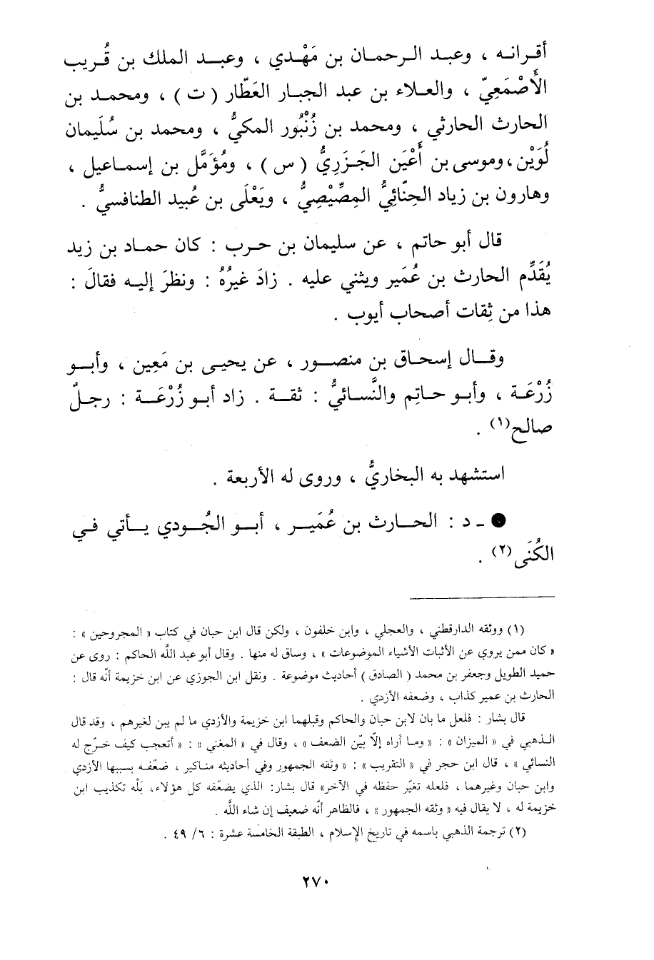 (1) ووثقه الدارقطني، والعجلي، وابن خلفون، ولكن قال ابن حبان في كتاب"المجروحين": كان ممن يروي عن الاثبات الاشياء الموضوعات"، وساق له منها. وَقَال أَبُو عَبْد اللَّهِ الحاكم: روى عن حميد الطويل وجعفر بن محمد (الصادق) أحاديث موضوعة. ونقل ابن الجوزي عن ابن خزيمة أنه قال: الحارث بن عُمَير كذاب، وضعفه الأزدي. قال بشار: فلعل ما بان لابن حبان والحاكم وقبلهما ابن خزيمة والأزدي ما لم يبن لغيرهم، وقد قال الذهبي في "الميزان": وما أراه إلا بين الضعف"، وَقَال في "المغني": أتعجب كيف خرج له النَّسَائي"، قال ابن حجر في "التقريب": وثقه الجمهور وفي أحاديثه مناكير، ضعفه بسببها الأزدي وابن حبان وغيرهما، فلعله تغير حفظه في الآخر"قال بشار: الذي يضعفه كل هؤلاء، بله تكذيب ابن خزيمة له، لا يقال فيه"وثقه الجمهور"، فالظاهر أنه ضعيف إن شاء الله.