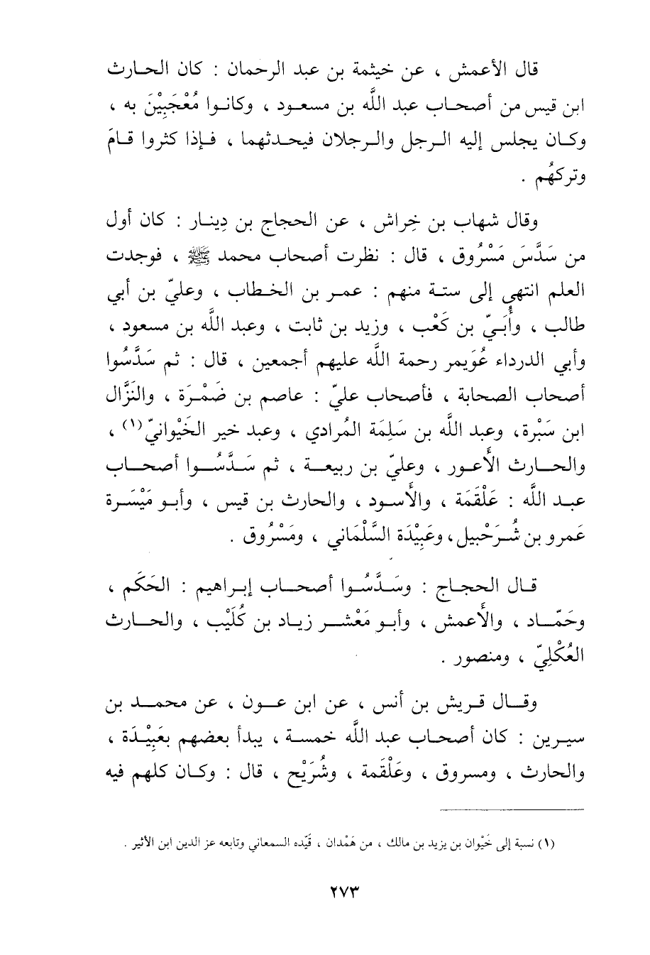 وَقَال شهاب بْن خراش، عن الحجاج بْن دينار: كَانَ أول من سدس مسروق، قال: نظرت أصحاب مُحَمَّد صَلَّى اللَّهُ عَلَيْه وسلم، فوجدت العلم انتهى إلى ستة منهم: عُمَر بْن الخطاب، وعلي بن أَبي طالب، وأبي بْن كعب، وزيد بْن ثابت، وعبد اللَّه بْن مسعود، وأَبي الدَّرْدَاء عويمر رحمة اللَّه عليهم أجمعين، قال: ثم سدسوا أصحاب الصحابة، فأصحاب علي: عاصم بْن ضمرة، والنزال ابن سبرة، وعبد اللَّه بْن سلمة المرادي، وعبد خير الخيواني (1) ، والحارث الأَعور، وعلي بْن ربيعة، ثم سدسوا أصحاب عَبد اللَّهِ: علقمة، والأسود، والحارث بْن قيس، وأَبُو ميسرة عَمْرو بْن شرحبيل، وعُبَيدة السلماني، ومسروق.