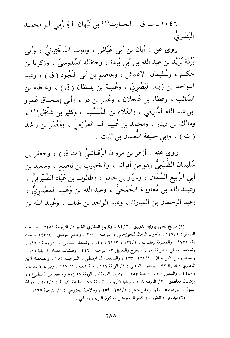 1046 ت ق: الحارث بن نبهان الجرمي أَبُو مُحَمَّد البَصْرِيّ (1) .