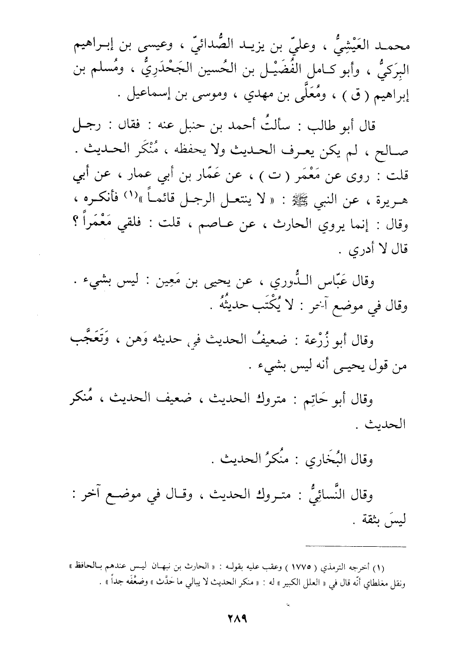 (1) أخرجه التِّرْمِذِيّ (1775) وعقب عليه بقوله: الحارث بن نبهان ليس عندهم بالحافظ"ونقل مغلطاي أنه قال في "العلل الكبير"له: منكر الحديث لا يبالي ما حدث"وضعفه جدا".