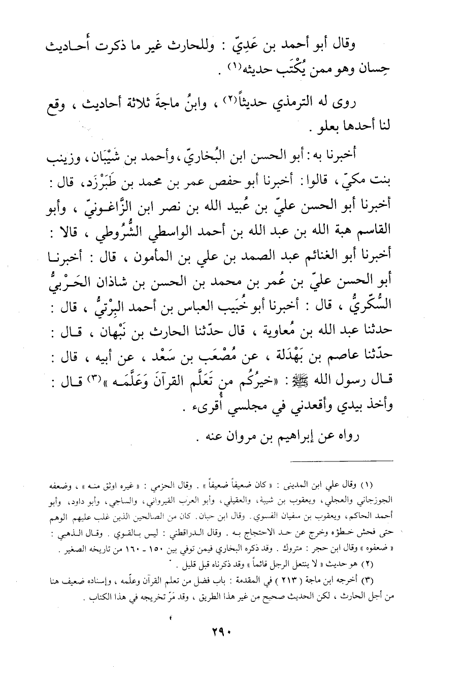 أَخْبَرَنَا بِهِ: أَبُو الْحَسَنِ بْنُ الْبُخَارِيِّ، وأحمد بْن شَيْبَانَ، وزَيْنَبُ بِنْتُ مَكِّيٍّ، قَالُوا: أَخْبَرَنَا أَبُو حَفْص عُمَر بْن محمد بن طَبَرْزَذَ، قال: أَخْبَرَنَا أَبُو الْحَسَن علي بْنُ عُبَيد اللَّهِ بْنِ نَصْرِ ابن الزَّاغُونِيِّ، وأَبُو الْقَاسِمِ هِبَةُ اللَّهِ بْن عَبد اللَّهِ بْن أَحْمَد الْوَاسِطِيُّ الشُّرُوطِيُّ، قَالا: أَخْبَرَنَا أَبُو الْغَنَائِمِ عَبْدُ الصَّمَدِ بْنُ عَلِيِّ بْنِ الْمَأْمُونِ، قال: أَخْبَرَنَا أَبُو الْحَسَنِ عَلِيُّ بْنُ عُمَر بْنِ مُحَمَّدِ بْنِ الْحَسَنِ بْنِ شَاذَانَ الْحَرْبِيُّ السُّكَّرِيُّ، قال: أَخْبَرَنَا أَبُو خُبَيْبٍ الْعَبَّاسُ بْنُ أَحْمَدَ الْبِرْتِيُّ، قال: حَدَّثَنَا عَبد اللَّهِ بْن مُعَاوِيَةَ، قال حَدَّثَنَا الْحَارِثُ بْنُ نَبْهَانَ، قال: حَدَّثَنَا عَاصِمُ بْنُ بَهْدَلَةَ، عَنْ مُصْعَبِ بْنِ سَعْدٍ، عَن أَبِيهِ، قال: قال رَسُولُ اللَّهِ صلى الله عليه وسلم: خَيْرُكُمْ مَنْ تَعَلَّمَ الْقُرْآنَ وعَلَّمَهُ" (3) قال: وأَخَذَ بِيَدِي وأَقْعَدَنِي فِي مَجْلِسِي أُقْرِئُ.