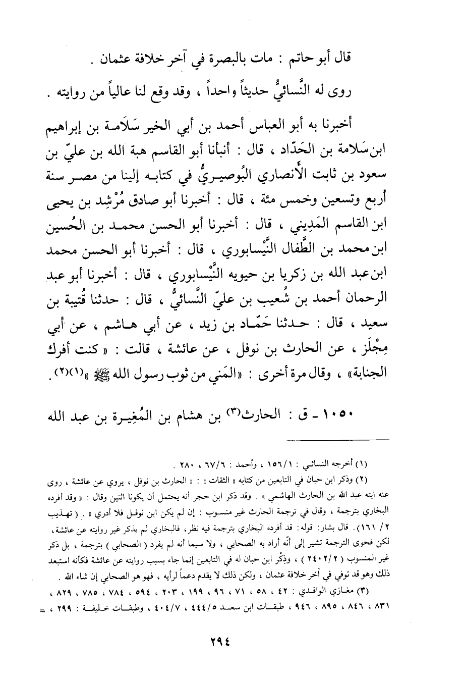 أخبرنا بِهِ أَبُو الْعَبَّاسِ أَحْمَدُ بْن أَبي الخير سلامة بْن إبراهيم ابن سَلامَةَ بْنِ الْحَدَّادِ، قال: أَنْبَأَنَا أَبُو الْقَاسِمِ هِبَةُ اللَّهِ بْنُ عَلِيِّ بْنِ سُعُودِ بْنِ ثَابِتٍ الأَنْصارِيّ الْبُوصِيرِيُّ فِي كِتَابِهِ إِلَيْنَا مِنْ مِصْرَ سَنَةَ أَرْبَعٍ وتِسْعِينَ وخمس مئة، قال: أَخْبَرَنَا أَبُو صَادِقٍ مُرْشِدُ بن يحيى ابن الْقَاسِمِ الْمَدِينِيُّ، قال: أَخْبَرَنَا أَبُو الحسن محمد بن الحسين ابن مُحَمَّدِ بْنِ الطَّفَّالِ النَّيْسَابُورِيُّ، قال: أخبرنا أبو الحسن مُحَمَّدِ ابْنِ عَبد اللَّهِ بْنِ زَكَرِيَّا بْنِ حَيَّوَيْهِ النَّيْسَابُورِيُّ، قال: أَخْبَرَنَا أَبُو عَبْدِ الرَّحْمَنِ أَحْمَدُ بْنُ شُعَيْبِ بْنِ عَلِيٍّ النَّسَائي، قال: حَدَّثَنَا قُتَيْبَةُ بْنُ سَعِيد، قال: حَدَّثَنَا حماد بْن زيد، عَن أَبِي هَاشِمٍ، عَن أَبِي مِجْلَزٍ، عَنِ الْحَارِثِ بْنِ نَوْفَلٍ، عَنْ عَائِشَةَ، قَالَتْ: كُنْتُ أَفْرُكُ الْجَنَابَةَ"، وَقَال مَرَّةً أُخْرَى: الْمَنِيَّ مِنْ ثَوْبِ رَسُولِ اللَّهِ صَلَّى اللَّهُ عَلَيْه وسَلَّمَ" (1) (2) .