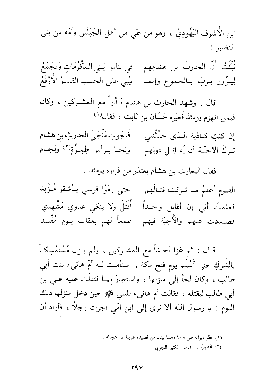 ابن الأشرف اليهودي، وهو من طي من أهل الجبلين وأمه من بني النضير: نبئت أن الحارث بْن هشامهم • في الناس يبني المكرمات ويجمع