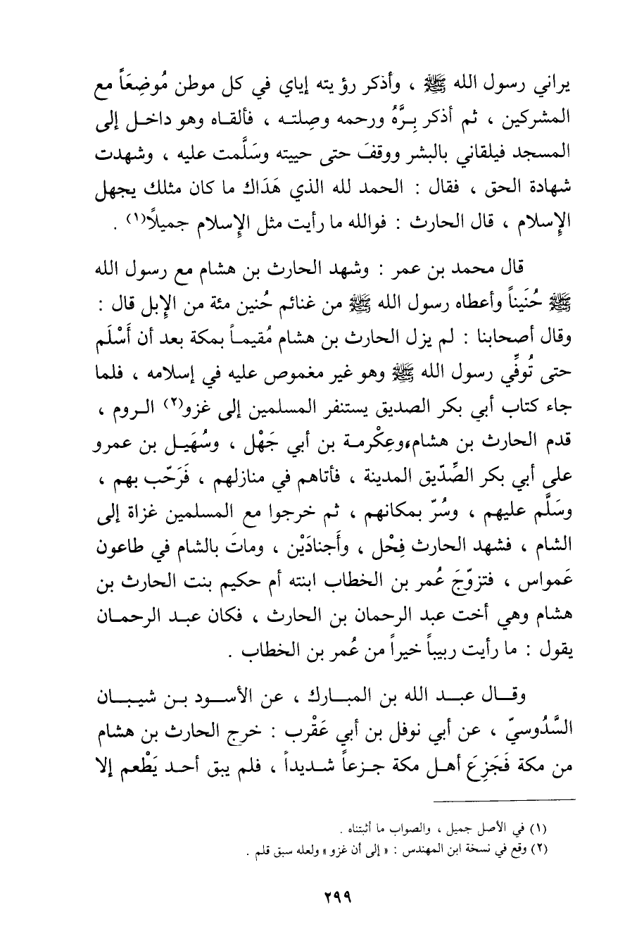 قال مُحَمَّد بْن عُمَر: وشهد الحارث بْن هشام مع رَسُول اللَّهِ صَلَّى اللَّهُ عليه وسلم حنينا وأعطاه رَسُول اللَّهِ صَلَّى اللَّهُ عليه وسلم من غنائم حنين مئة من الإبل قال: وَقَال أصحابنا: لم يزل الحارث بْن هشام مقيما بمكة بعد أن أسلم حتى توفي رَسُول اللَّهِ صَلَّى اللَّهُ عليه وسلم وهو غير مغموص عليه في إسلامه، فلما جاء كتاب أبي بكر الصديق يستنفر المسلمين إلى غزو (2) الروم، قدم الحارث بْن هشام، وعكرمة بْن أَبي جهل، وسهيل بْن عَمْرو على أبي بكر الصديق المدينة، فأتاهم في منازلهم، فرحب بهم، وسلم عليهم، وسر بمكانهم، ثم خرجوا مع المسلمين غزاة إلى الشام، فشهد الحارث فحل، وأجنادين، ومات بالشام في طاعون عمواس، فتزوج عُمَر بْن الخطاب ابنته أم حكيم بنت الحارث بْن هشام وهي أخت عَبْد الرَّحْمَنِ بْن الحارث، فَكَانَ عَبْد الرَّحْمَنِ يقول: ما رأيت ربيبا خيرا من عُمَر بْن الخطاب.