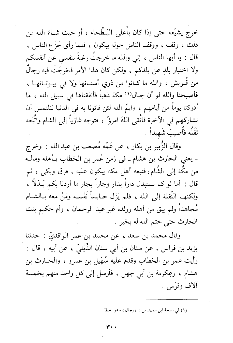 خرج يشيعه حتى إذا كَانَ بأعلى البطحاء، أو حيث شاء اللَّه من ذلك، وقف، ووقف الناس حوله يبكون، فلما رأى جزع الناس، قال: يا أيها الناس، إني والله ما خرجت رغبة بنفسي عن أنفسكم ولا اختيار بلد عن بلدكم، ولكن كَانَ هذا الأمر فخرجت فيه رجال من قريش، والله ما كانوا من ذوي أسنانها ولا في بيوتاتها، فأصبحنا والله لو أن جبال (1) مكة ذهبا فأنفقناها في سبيل اللَّه، ما أدركنا يوما من أيامهم، وايم اللَّه لئن فأتونا بِهِ في الدنيا لنلتمس أن نشاركهم في الآخرة فاتقى اللَّه امرؤ، فتوجه غازيا إلى الشام واتبعه ثقله فأصيب شهيدا.