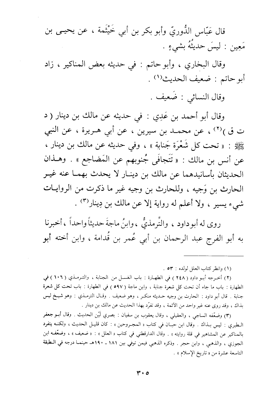 (2) أخرجه أبو داود (248) في الطهارة: باب الغسل من الجنابة، والتِّرْمِذِيّ (106) في الطهارة: باب ما جاء أن تحت كل شعرة جنابة، وابن ماجة (597) في الطهارة: باب تحت كل شعرة جنابة. قال أبو داود: الحارث بن وجيه حديثه منكر، وهو ضعيف. وَقَال التِّرْمِذِيّ: وهو شيخ ليس بذاك، وقد روى عنه غير واحد من الأئمة، وقد تفرد بهذا الحديث عن مالك بن دينار.