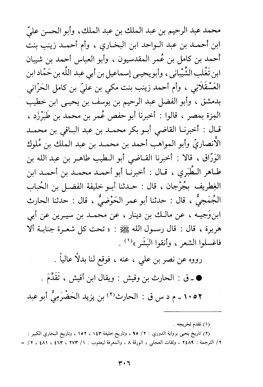 الأَنْصارِيّ وأَبُو الْمَوَاهِبِ أَحْمَد بْن مُحَمَّد بْن عَبد المَلِك بْنِ مُلُوكٍ الْوَرَّاقُ، قالا: أَخْبَرَنَا الْقَاضِي أَبُو الطَّيِّبِ طَاهِرُ بْن عَبد اللَّهِ بْن طاهر الطَّبَرِيُّ، قال: أَخْبَرَنَا أَبُو أَحْمَدَ مُحَمَّدُ بْنُ أَحْمَدَ بْنِ الْغِطْرِيفِ بِجُرْجَانَ، قال: حَدَّثَنَا أَبُو خَلِيفَةَ الْفَضْلُ بْنُ الْحُبَابِ الْجُمَحِيُّ، قال: حَدَّثَنَا أَبُو عُمَر الْحَوْضِيُّ، قال: حَدَّثَنَا الحارث ابن وجِيهٍ، عَنْ مَالِكِ بْنِ دِينَارٍ، عَنْ مُحَمَّدِ بْنِ سِيرِينَ عَن أَبِي هُرَيْرة، قال: قال رَسُولُ اللَّهِ صلى الله عليه وسلم: تَحْتَ كُلِّ شَعْرَةٍ جَنَابَةٌ أَلا فَاغْسِلُوا الشَّعْرَ، وأَنْقُوا الْبَشَرَ" (1) .