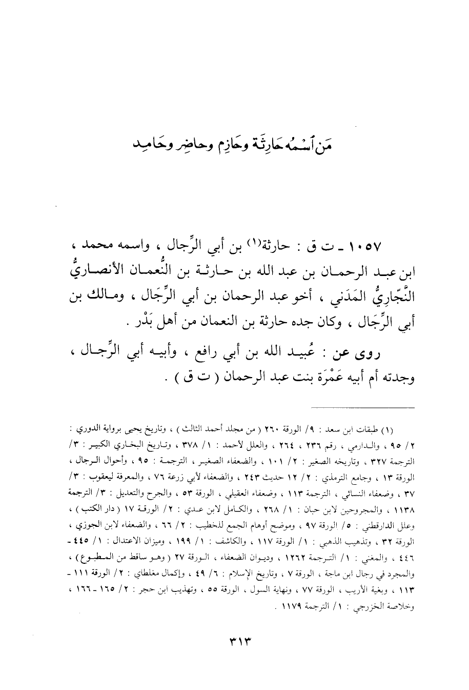 1057 ت ق: حارثة بن أَبي الرجال (1) ، واسمه محمد، ابْن عَبْد الرَّحْمَنِ بن عَبد اللَّهِ بْنِ حارثة بْن النعمان الأَنْصارِيّ النجاري المدني، أخو عَبْد الرَّحْمَنِ بْن أَبي الرجال، ومالك بْن أَبي الرجال، وكَانَ جده حارثة بْن النعمان من أهل بدر.