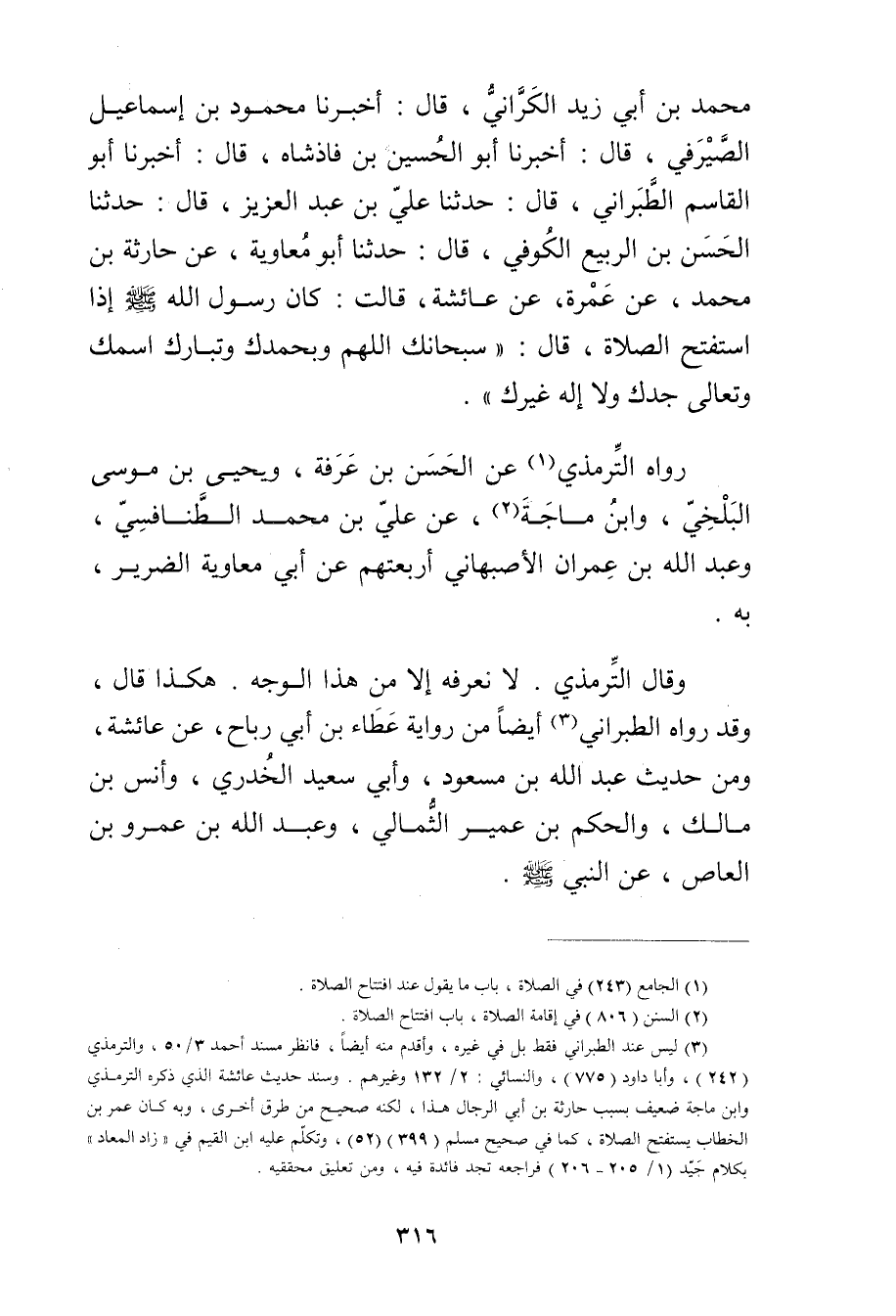 مُحَمَّد بْن أَبي زَيْدٍ الْكَرَّانِيُّ، قال: أَخْبَرَنَا مَحْمُودُ بْنُ إِسْمَاعِيلَ الصَّيْرَفِيُّ، قال: أخبرنا أَبُو الْحُسَيْنِ بْنُ فَاذْشَاهِ، قال: أخبرنا أَبُو الْقَاسِمِ الطَّبَرَانِيُّ، قال: حَدَّثَنَا علي بْن عبد العزيز، قال: حَدَّثَنَا الْحَسَنُ بْنُ الرَّبِيعِ الْكُوفِيُّ، قال: حَدَّثَنَا أَبُو مُعَاوِيَةَ، عَنْ حَارِثَةَ بْنِ مُحَمَّدٍ، عَنْ عُمَرة، عَنْ عَائِشَةَ، قَالَتْ: كَانَ رَسُول اللَّهِ صلى الله عليه وسَلَّمَ إِذَا اسَتْفَتَحَ الصَّلاةَ، قال: سُبْحَانَكَ اللَّهُمَّ وبِحَمْدِكَ وتَبَارَكَ اسْمُكَ وتَعَالَى جَدُّكَ ولا إِلَهَ غَيْرُكَ.