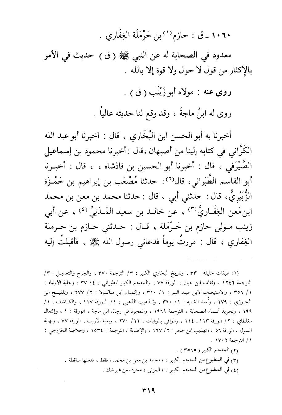 أَخْبَرَنَا بِهِ أَبُو الحسين ابْنُ الْبُخَارِيِّ، قال: أَخْبَرَنَا أَبُو عَبْدِ اللَّهِ الْكَرَّانِيُّ فِي كِتَابِهِ إِلَيْنَا مِنْ أَصْبَهَانَ، قال: أَخْبَرَنَا مَحْمُودُ بْنُ إِسْمَاعِيلَ الصَّيْرَفِيُّ، قال: أخبرنان أَبُو الْحُسَيْنِ بْنُ فَاذْشَاهِ، قال: أخبرنا أَبُو الْقَاسِمِ الطَّبَرَانِيُّ، قال (2) : حَدَّثَنَا مُصْعَبُ بْنُ إِبْرَاهِيمَ بْنِ حَمْزَةَ الزُّبَيْرِيُّ، قال: حَدَّثني أَبِي، قال: حَدَّثَنَا مُحَمَّدُ بْنُ مَعْنِ بن محمد ابن مَعْنِ الْغِفَارِيُّ (3) ، عَنْ خَالِدِ بْنِ سَعِيد الْمَدَنِيِّ (4) ، عَن أَبِي زَيْنَبَ مَوْلَى حَازِمِ بْنِ حَرْمَلَةَ، قال: حَدَّثَنِي حَازِمُ بْنُ حَرْمَلَةَ الْغِفَارِيُّ، قال: مَرَرْتُ يَوْمًا فَدَعَانِي رَسُولُ اللَّهِ صلى الله عليه وسلم، فأقبلت إليه