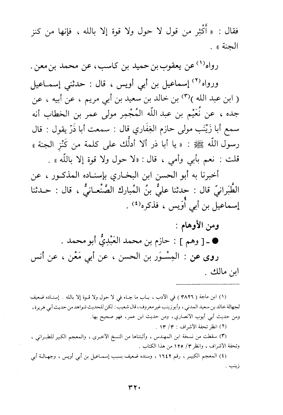 ورَوَاهُ (2) إِسْمَاعِيلُ بْنُ أَبي أُوَيْسٍ، قال: حدثني إسماعيل (ابن عَبد اللَّهِ) (3) بْن خالد بْن سَعِيد بْن أَبي مريم، عَن أَبِيهِ، عَنْ جَدِّهِ، عَنْ نُعَيْمِ بْنِ عَبد اللَّهِ الْمُجْمِرُ مَوْلَى عُمَر بْنِ الْخَطَّابِ أَنَّهُ سَمِعَ أَبَا زَيْنَبَ مَوْلَى حَازِمٍ الْغِفَارِيِّ قال: سَمِعْتُ أَبَا ذَرٍّ يَقُولُ: قال رَسُولُ اللَّهِ صلى الله عليه وسلم: يَا أَبَا ذَرٍّ أَلا أَدُلُّكَ عَلَى كَلِمَةٍ مِنْ كَنْزِ الْجَنَّةِ"قُلْتُ: نَعَمْ بِأَبِي وأمي، قال: لا حول ولاقوة إِلا بِاللَّهِ.