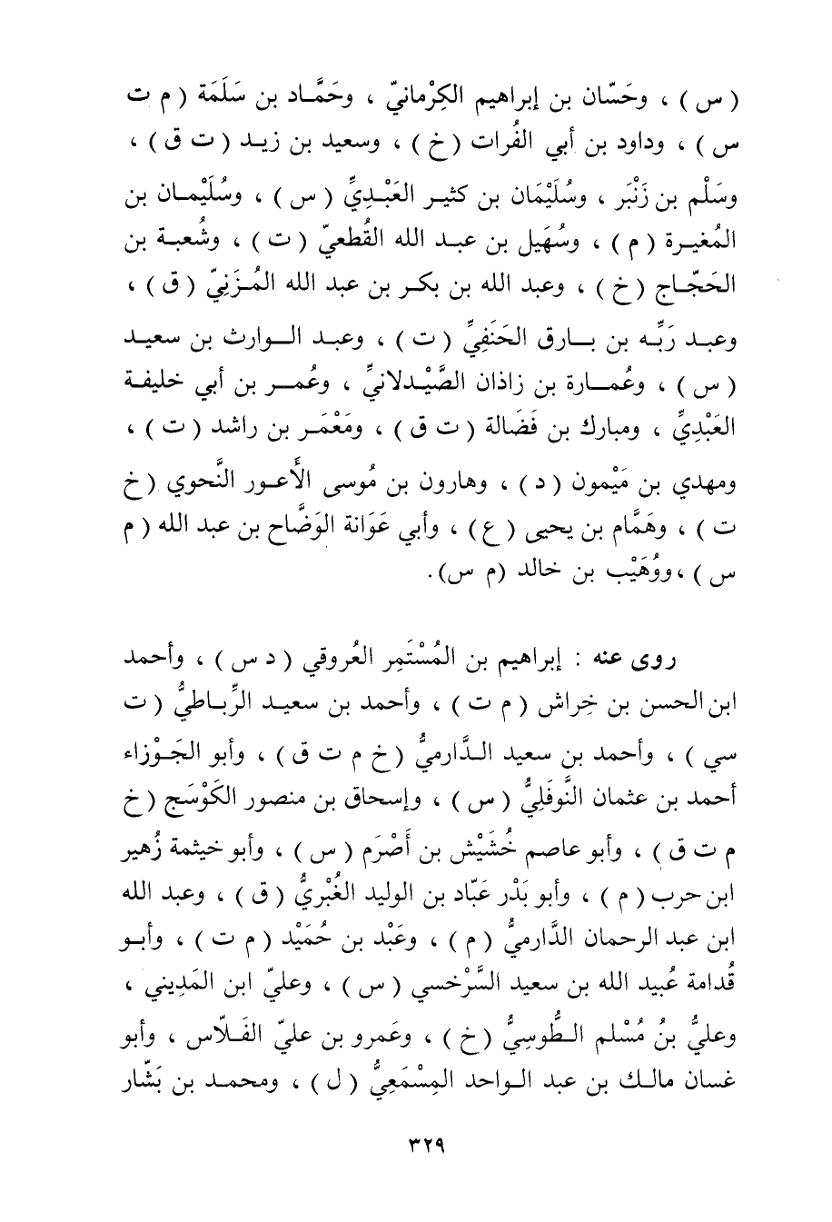 (س) ، وحسان بْن إبراهيم الكرماني، وحماد بْن سلمة (م ت س) ، وداود بْن أَبي الفرات (خ) ، وسَعِيد بْن زيد (ت ق) ، وسلم بْن زنبر، وسُلَيْمان بْن كثير العبدي (س) ، وسُلَيْمان بْن المغيرة (م) ، وسهيل بْن عَبد اللَّهِ القطعي (ت) ، وشعبة بْن الحجاج (خ) ، وعبد اللَّه بْن بكر بْن عَبد اللَّهِ المزني (ق) ، وعبد ربه بْن بارق الحنفي (ت) ، وعبد الوارث بْن سَعِيد (س) ، وعمارة بْن زاذان الصيدلاني، وعُمَر بْن أَبي خليفة العبدي، ومبارك بْن فضالة (ت ق) ، ومَعْمَر بْن راشِد (ت) ، ومهدي بْن ميمون (د) ، وهارون بْن مُوسَى الأَعور النحوي (خ ت) ، وهمام بْن يَحْيَى (ع) ، وأبي عوانة الوضاح بْن عَبد اللَّهِ (م س) ، ووهيب بْن خالد (م س) .