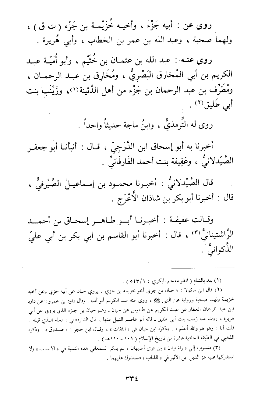 (2) قال ابن ماكولا: حبان بن جزي أخو خزيمة بن جزي. يروى حبان عَن أبيه جزي وعن أخيه خزيمة ولهما صحبة ورواية عَنِ النَّبِيِّ صَلَّى اللَّهُ عَلَيْهِ وسَلَّمَ، روى عنه عبد الكريم أبو أمية. وَقَال داود بن عَمْرو: عن داود ابن عبد الرحمن عن عبد الكريم عن طاوس عن حبان وهو حبان بن جزء الذي يروى عَن أَبِي هُرَيْرة، روت عن زينب بنت أبي طليق قاله أبو عاصم النبيل عنها، قال الدارقطني: لعله الذي قبله. قلت أنا: وهو هو والله أعلم". وذكره ابنُ حِبَّان في "الثقات"، وَقَال ابن حجر: صدوق.