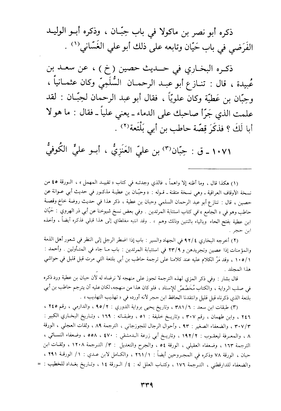 (2) أخرجه البخاري 4 / 92 في الجهاد والسير: باب إذا اضطر الرجل إلى النظر في شعور أهل الذمة والمؤمنات إذا عصين وتجريدهن و9 / 23 في استتبابة المرتدين: باب ما جاء في المتأولين. وأحمد: 1 / 105، وقد مر الكلام عليه عند كلامنا على ترجمة حاطب بن أَبي بلتعة التي مرت قبل قليل في حواشي هذا المجلد. قال بشار: وفي ذكر المزي لهذه الترجمة تجوز على منهجه لا نرضاه له لان حبان بن عطية ورد ذكره في صلب الرواية، والكتاب مخصص للإسناد، فلو كان هذا من منهجه، لكان عليه أن يترجم حاطب بن أَبي بلتعة الذي ذكرناه قبل قليل وانتقدنا الحافظ ابن حجر لانه أورده في "تهذيب التهذيب.