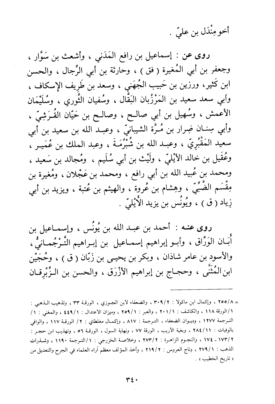 = 8 / 255، وإكمال ابن ماكولا: 2 / 309، والضعفاء لابن الجوزي، الورقة 33، وتذهيب الذهبي: 1 / الورقة 118، والكاشف: 1 / 201، والعبر: 1 / 259، وميزان الاعتدال: 1 / 449، والمغني: 1 / الترجمة 1277، وديوان الضعفاء، الترجمة: 817، وإكمال مغلطاي: 2 / الورقة 117، والوافي بالوفيات: 11 / 284، وبغية الاريب، الورقة 77، ونهاية السول، الورقة 56، وتهذيب ابن حجر: 2 / 174 173، والنجوم الزاهرة: 2 / 273، وخلاصة الخزرجي: 1 / الترجمة 1190، وشذرات الذهب: 1 / 279، وتاج العروس: 2 / 219، وأخذ المؤلف معظم آراء العلماء في الجرح والتعديل من"تاريخ الخطيب".