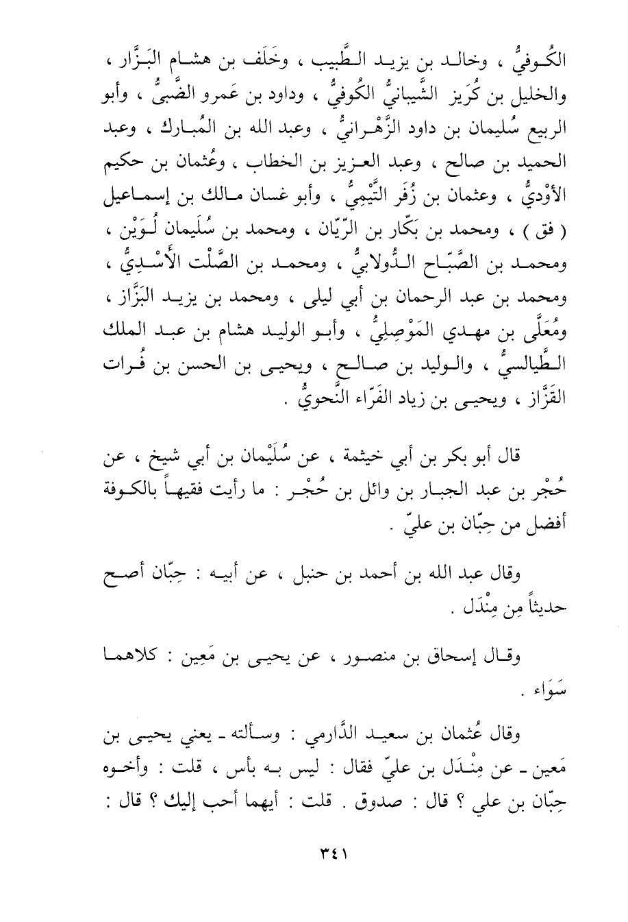 قال أَبُو بكر بْن أَبي خيثمة، عَن سُلَيْمان بْن أَبي شيخ، عن حجر بْن عَبْدِ الجبار بْن وائل بْن حجر: ما رأيت فقيها بالكوفة أفضل من حبان بْن علي.