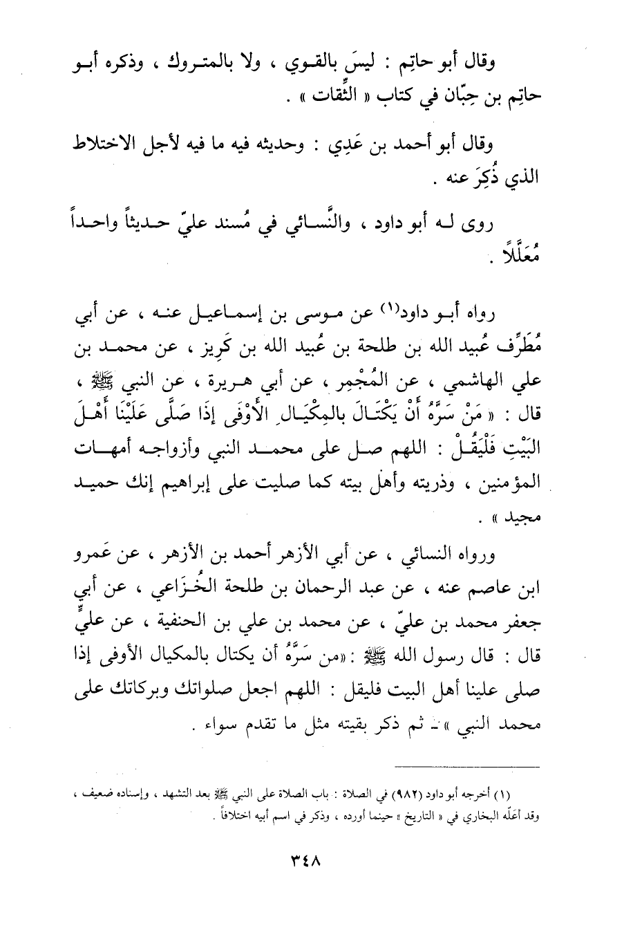 رواه أَبُو داود (1) عَنْ مُوسَى بْنِ إِسْمَاعِيلَ عَنْهُ، عَن أَبِي مُطَرِّفٍ عُبَيد اللَّهِ بْنِ طَلْحَةَ بْن عُبَيد الله بْن كريز، عَنْ مُحَمَّدِ بْنِ عَلِيٍّ الْهَاشِمِيِّ، عَنِ الْمُجْمِرِ، عَن أَبِي هُرَيْرة، عَنِ النَّبِيِّ صلى الله عليه وسَلَّمَ، قال: مَنْ سَرَّهُ أَنْ يكتال بالمكيال الاوفى إذاا صَلَّى عَلَيْنَا أَهْلَ الْبَيْتِ فَلْيَقُلْ: اللَّهُمَّ صَلِّ عَلَى مُحَمَّدٍ النَّبِيِّ وأَزْوَاجِهِ أُمَّهَاتِ الْمُؤْمِنِينَ، وذُرِّيَّتِهِ وأَهْلِ بَيْتِهِ كَمَا صَلَّيْتَ عَلَى إِبْرَاهِيمَ إِنَّكَ حَمِيدٌ مَجِيدٌ.
