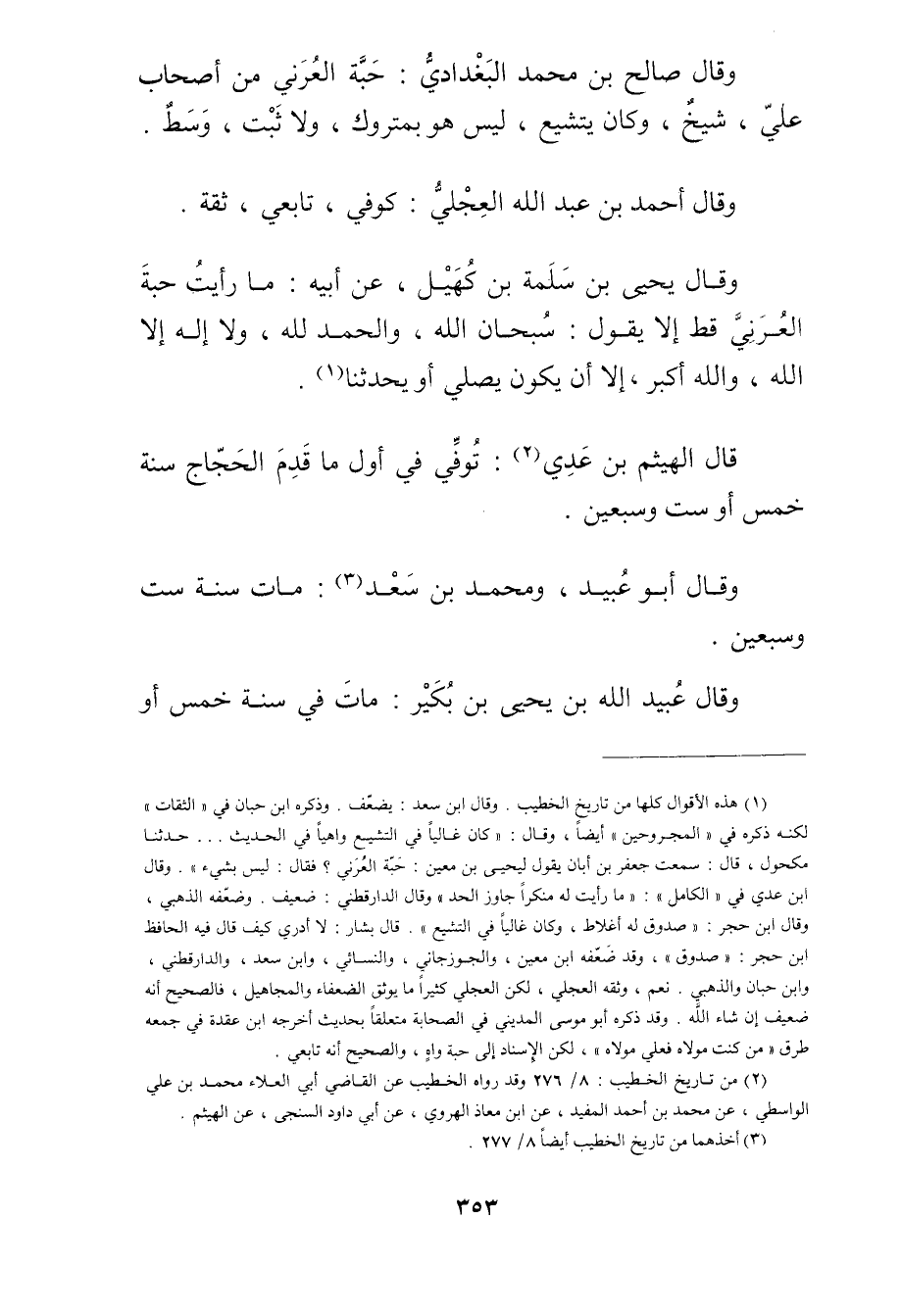 وذكره ابنُ حِبَّان في "الثقات" لكنه ذكره في "المجروحين"أيضا، وَقَال: كَانَ غاليا فِي التشيع واهيا في الحديث..حَدَّثَنَا مكحول، قال: سمعت جَعْفَر بْن أبان يَقُول ليحيى بن مَعِين: حبة العرني؟ فقال: ليس بشيءٍ". وَقَال ابن عدي في "الكامل": ما رأيت له منكرا جاوز الحد"وَقَال الدَّارَقُطْنِيُّ: ضعيف. وضعفه الذهبي، وَقَال ابن حجر: صدوق له أغلاط، وكان غاليا في التشيع". قال بشار: لا أدري كيف قال فيه الحافظ ابن حجر: صدوق"، وقد ضعفه ابن مَعِين، والجوزجاني، والنَّسَائي، وابن سعد، والدارقطني، وابن حبان والذهبي. نعم، وثقه العجلي، لكن العجلي كثيرا ما يوثق الضعفاء والمجاهيل، فالصحيح أنه ضعيف إن شاء الله.