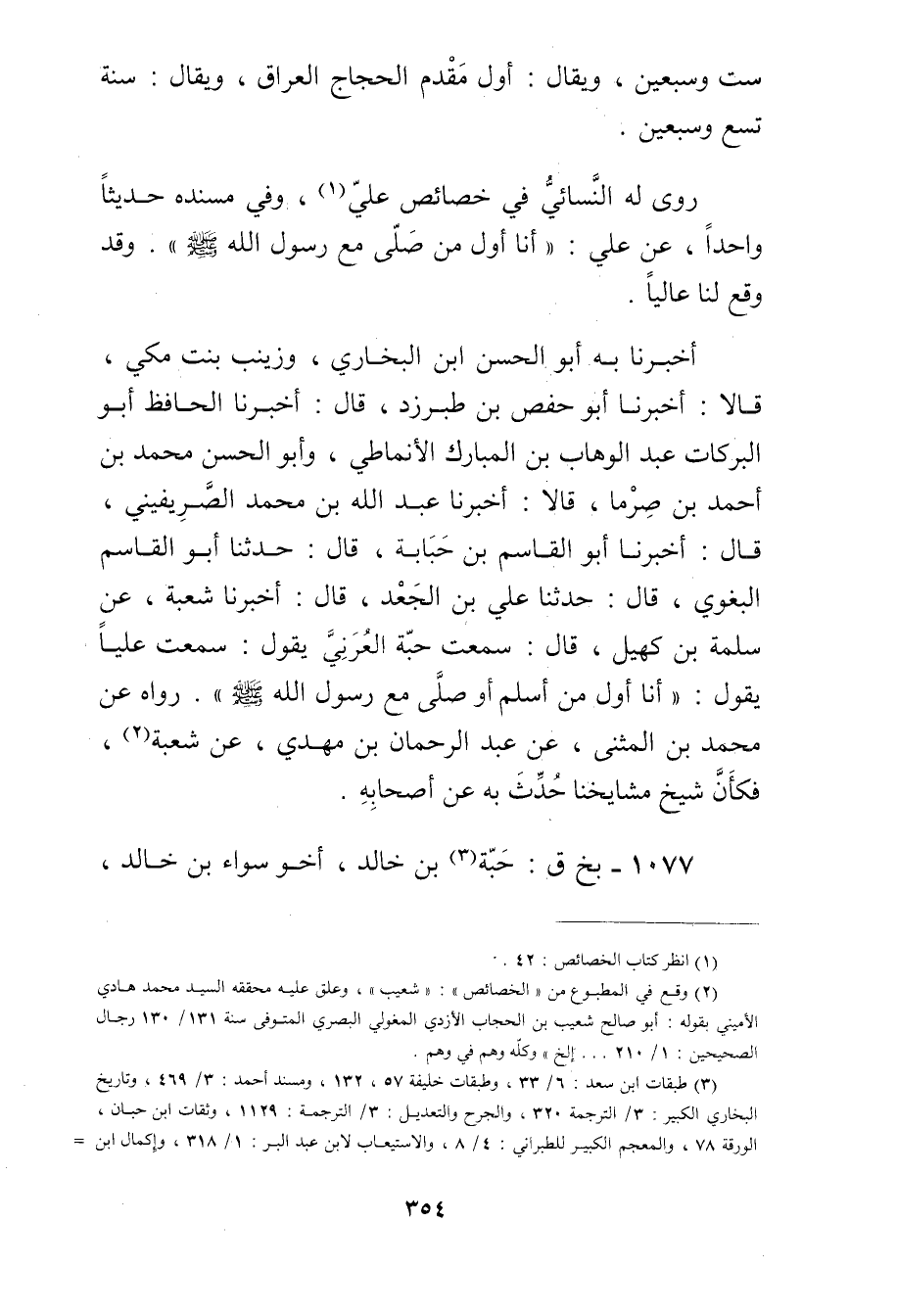 أَخْبَرَنَا بِهِ أَبُو الْحَسَنِ بْنُ الْبُخَارِيِّ، وزينب بنت مكي، قَالا: أخبرنا أبو حفص بن طَبَرْزَذَ، قال: أخبرنا الْحَافِظُ أَبُو الْبَرَكَاتِ عَبْدُ الوَّهَّابِ بْنُ الْمُبَارَكِ الأَنْمَاطِيُّ، وأَبُو الْحَسَن مُحَمَّد بْن أَحْمَد بْنِ صِرْمَا، قَالا: أَخْبَرَنَا عَبد الله بْن مُحَمَّد الصريفيني، قال: أخبرنا أَبُو القاسم بْن حبابة، قال: حَدَّثَنَا أبو القاسم البغوي، قال: حَدَّثَنَا علي بْن الجعد، قال: أَخْبَرَنَا شُعْبَةُ، عَنْ سَلَمَة بْنِ كُهَيْلٍ، قال: سَمِعْتُ حَبَّةَ الْعُرَنِيَّ يَقُولُ: سَمِعْتُ عَلِيًّا يَقُولُ: أَنَا أَوَّلُ مَنْ أَسْلَمَ أَوْ صلى مع رَسُول اللَّهِ صَلَّى اللَّهُ عَلَيْه وسَلَّمَ". رَوَاهُ عَنْ مُحَمَّدِ بْنِ الْمُثَنَّى، عَنْ عَبْدِ الرحمن بن مهدي، عن شبعة (2) ، فَكَأَنَ شَيْخَ مَشَايِخِنَا حَدَّثَ بِهِ عَنْ أَصْحَابِهِ.