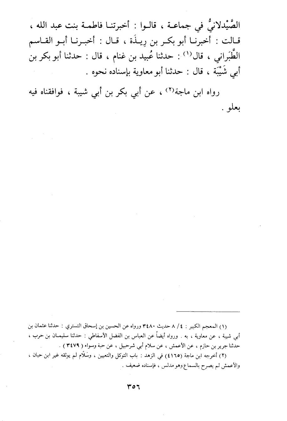 الصَّيْدَلانِيُّ فِي جَمَاعَةٍ، قَالُوا: أَخْبَرَتْنا فَاطِمَةُ بِنْتُ عَبد اللَّهِ، قَالَتْ: أخبرنا أَبُو بَكْرِ بْنُ رِيذَةَ، قال: أخبرنا أَبُو الْقَاسِمِ الطَّبَرَانِيُّ، قال (1) : حَدَّثَنَا عُبَيد بْنُ غَنَّامٍ، قال: حَدَّثَنَا أبو بكر بْن أَبي شَيْبَة، قال: حَدَّثَنَا أَبُو مُعَاوِيَةَ بِإِسْنَادِهِ نَحْوَهُ.