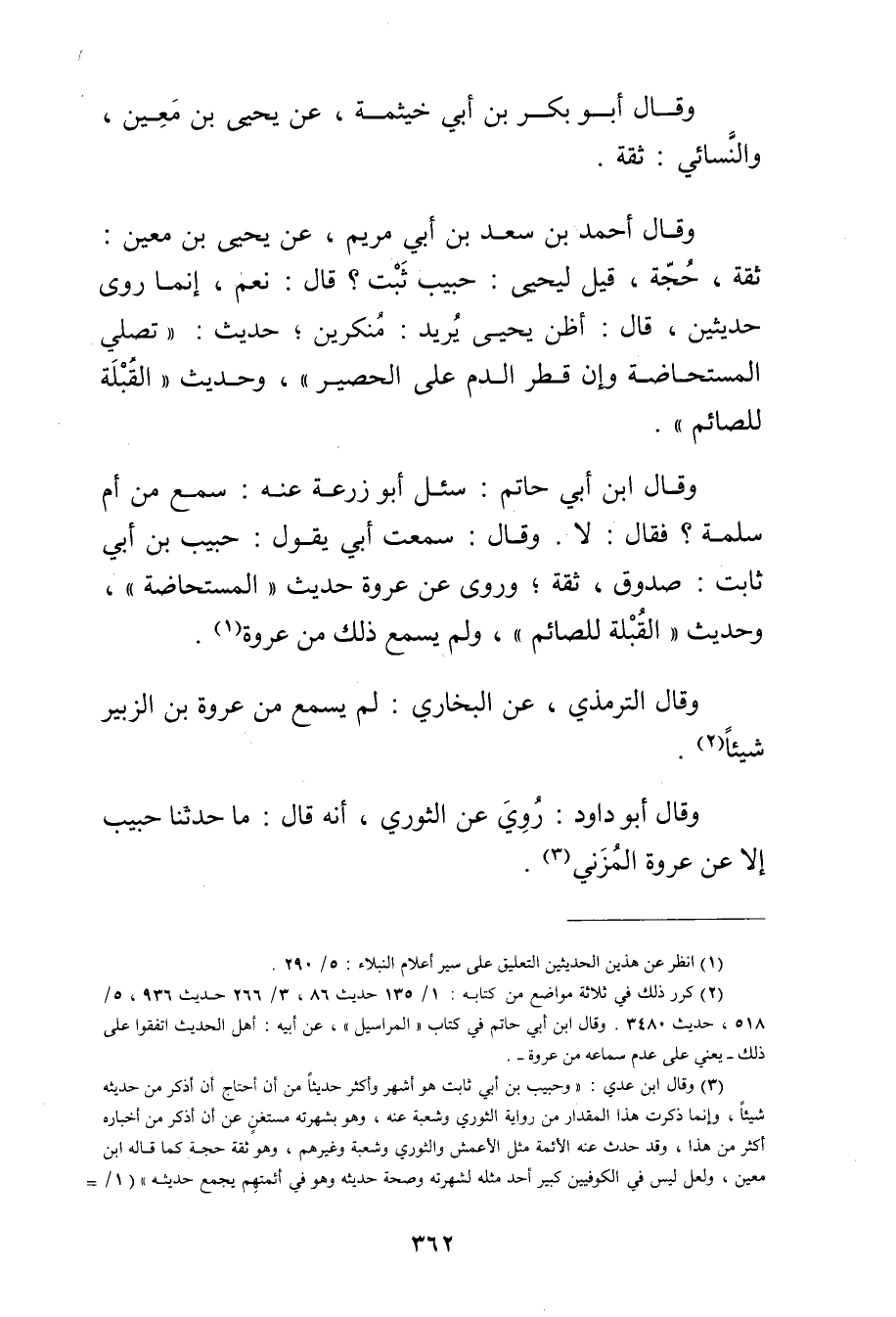 وَقَال ابن أَبي حاتم: سئل أَبُو زُرْعَة عَنه: سمع من أم سلمة؟ فَقَالَ: لا. وَقَال: سمعت أبي يقول: حبيب بْن أَبي ثابت: صدوق، ثقة، وروى عن عروة حديث: "المستحاضة"، وحديث"القبلة للصائم"، ولم يسمع ذلك من عروة (1) .