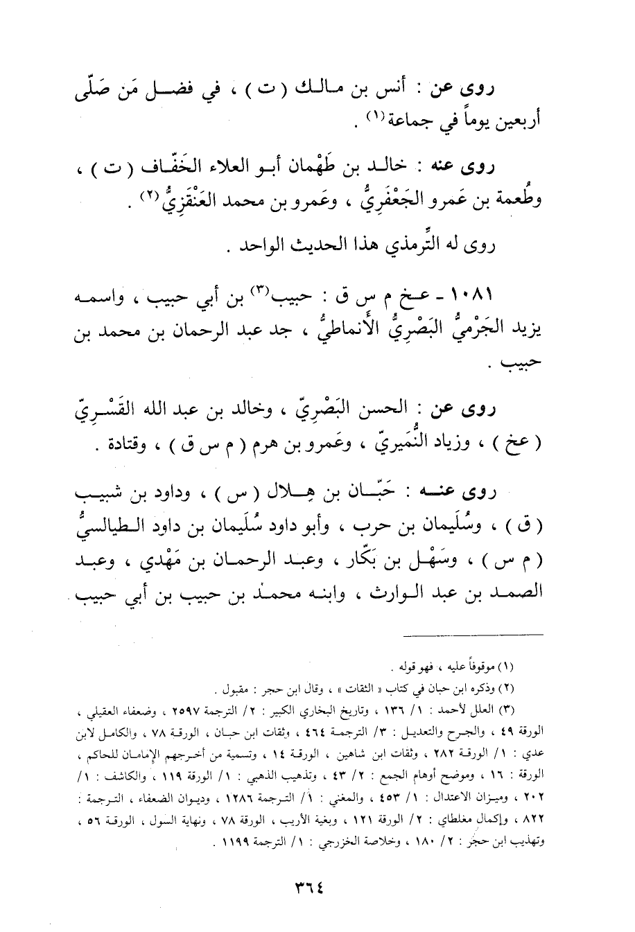 1081 عخ م س ق: حبيب بن أَبي حبيب (3) ، واسمه يزيد الجرمي البَصْرِيّ الأنماطي، جد عَبْد الرَّحْمَنِ بْن مُحَمَّدِ بْنِ حبيب.