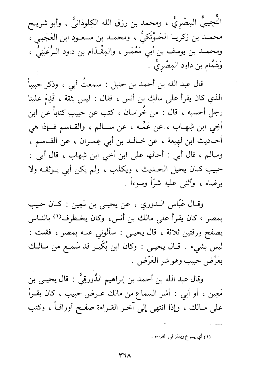 وَقَال عَباس الدُّورِيُّ، عَن يحيى بْن مَعِين: كَانَ حبيب بمصر، كَانَ يقرأ على مالك بْن أنس، وكَانَ يخطرف (1) بالناس يصفح ورقتين ثلاثة، قال يَحْيَى: سألوني عنه بمصر، فقلت: ليس بشيءٍ. قال يَحْيَى: وكَانَ ابن بكير قد سمع من مالك بعرض حبيب وهو شر العرض.