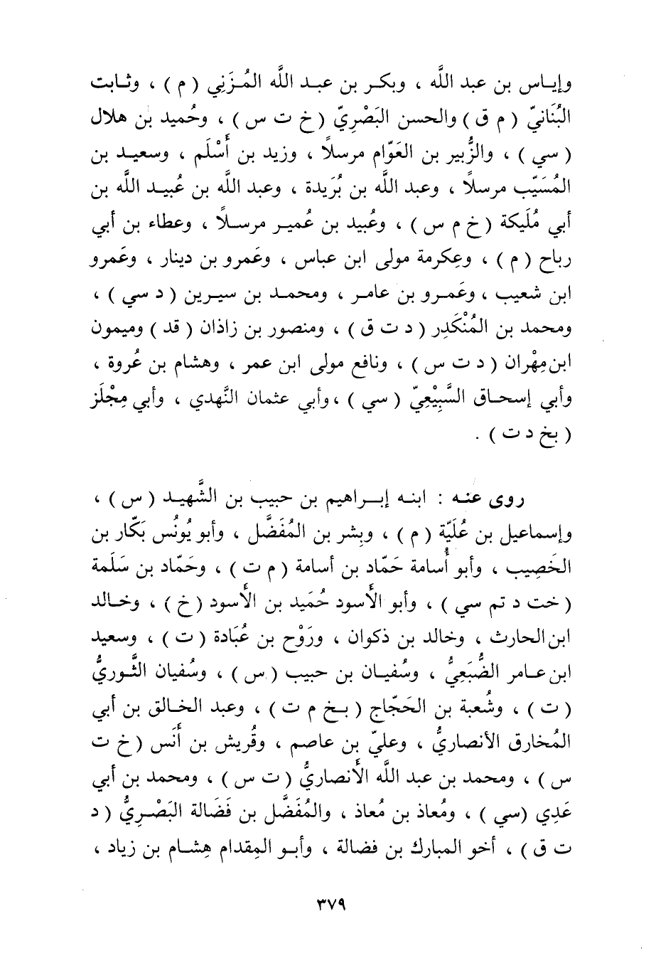 وإياس بْن عَبد اللَّهِ، وبكر بْن عَبد اللَّهِ المزني (م) ، وثابت البناني (م ق) ، والحسن البَصْرِيّ (خ ت س) ، وحميد بْن هلال (سي) ، والزبير بْن العوام مُرْسلاً، وزيد بْن أسلم، وسَعِيد بْن المُسَيَّب مُرْسلاً، وعبد اللَّه بْن بريدة، وعبد اللَّه بْن عُبَيد اللَّهِ بْن أَبي مُلَيْكَةَ (خ م س) ، وعُبَيد بْن عُمَير مُرْسلاً، وعطاء بْن أَبي رباح (م) ، وعكرمة مولى ابن عباس، وعَمْرو بْن دينار، وعَمْرو ابن شعيب، وعَمْرو بْن عامر، ومحمد بْن سيرين (د سي) ، ومحمد بْن المنكدر (د ت ق) ، ومنصور بن زاذان (قد) وميمون ابن مهران (د ت س) ، ونافع مولى ابن عُمَر، وهشام بْن عروة، وأبي إسحاق السبيعي (سي) ، وأبي عثمان النهدي، وأبي مجلز (بخ د ت) .