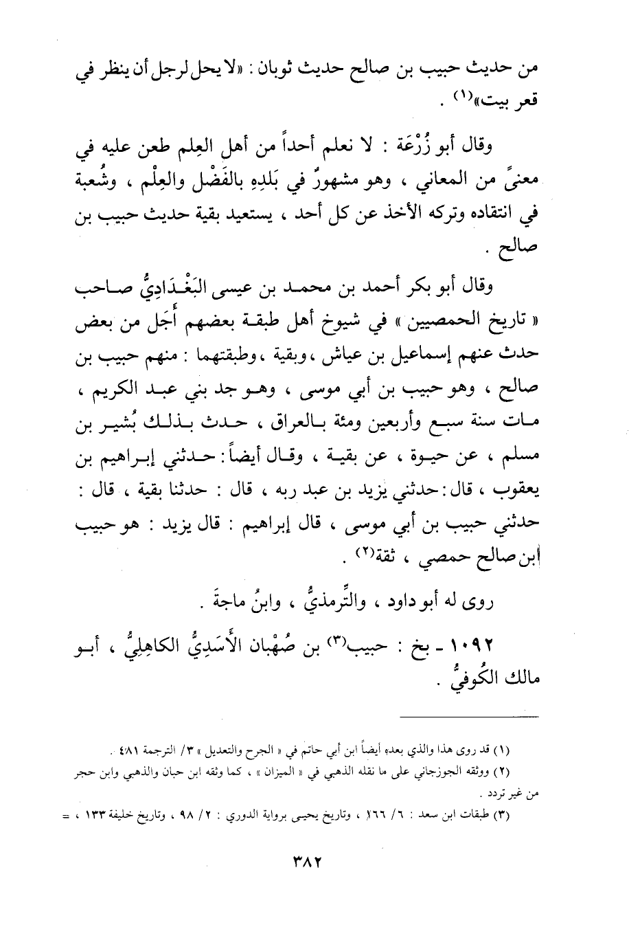 وَقَال أَبُو زُرْعَة: لا نعلم أحدا من أهل العلم طعن عليه في معنى من المعاني، وهو مشهور في بلده بالفضل والعلم، وشعبة في انتقاده وتركه الأخذ عن كل أحد، يستعيد بقية حديث حبيب بْن صالح.