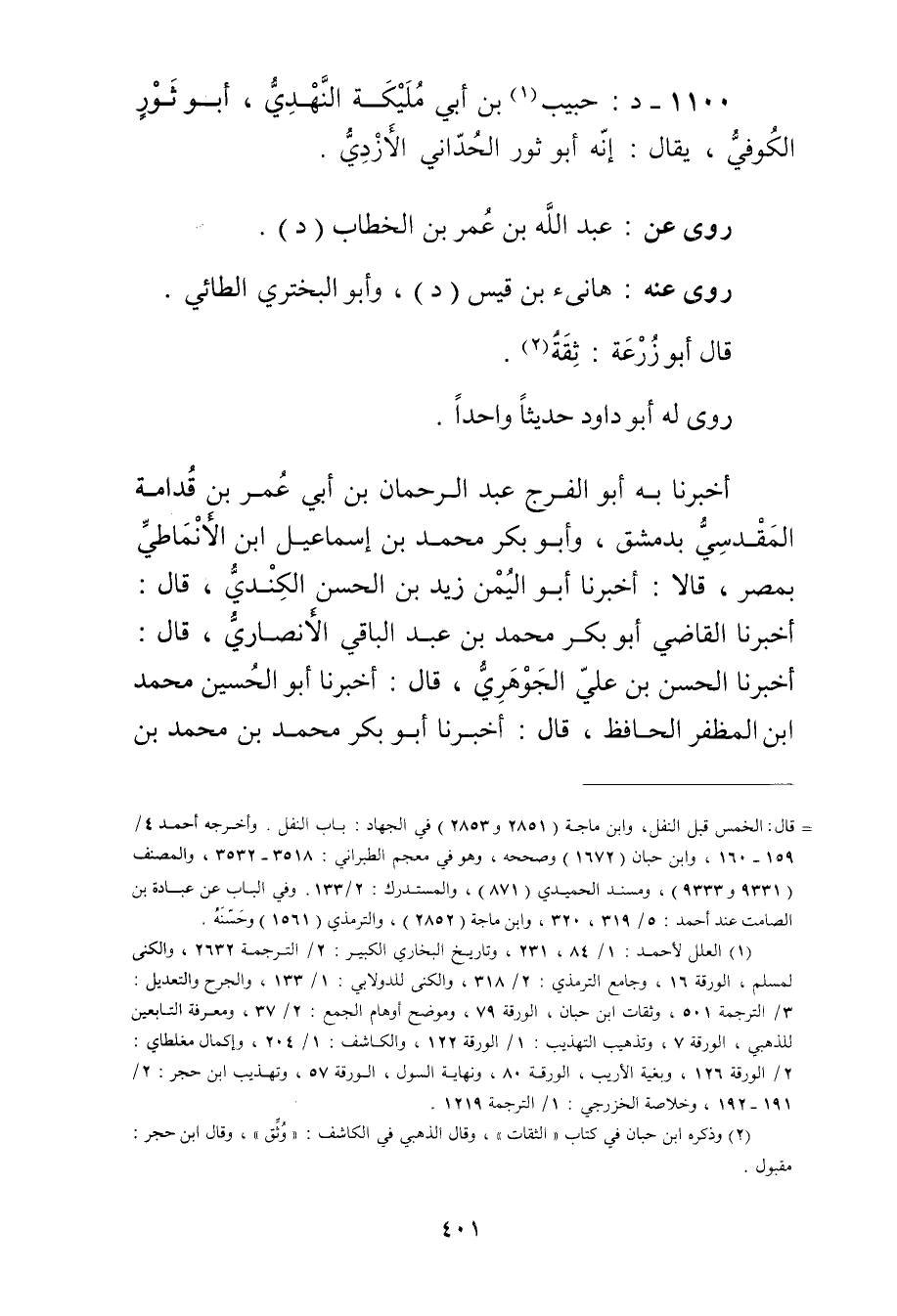 1100 د: حبيب بن أَبي مُلَيْكَةَ النهدي (1) ، أَبُو ثور الكوفي، يقال: إنه أَبُو ثور الحداني الأزدي.