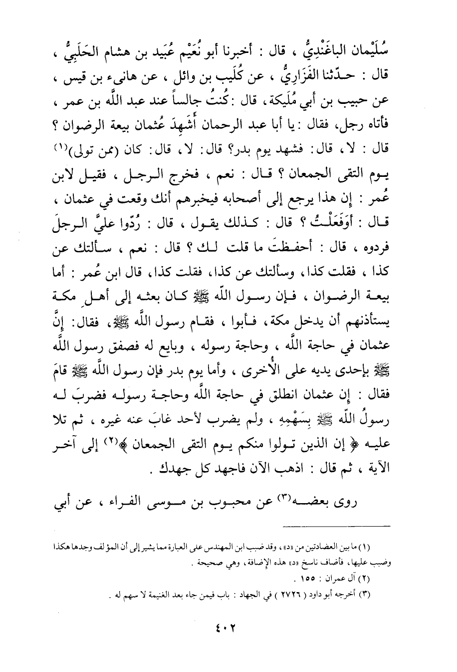 سُلَيْمان الْبَاغَنْدِيُّ، قال: أَخْبَرَنَا أَبُو نعيم عُبَيد بْن هشام الحلبي، قال: حَدَّثَنَا الْفَزَارِيُّ، عَنْ كُلَيْبِ بْنِ وائِلٍ، عَنْ هَانِئِ بْنِ قَيْسٍ، عَنْ حَبِيبِ بْنِ أَبي مُلَيْكَةَ، قال: كُنْتُ جَالِسًا عِنْدَ عَبد اللَّهِ بْنِ عُمَر، فَأَتَاهُ رجل، فقَالَ: يا أبا عَبْد الرَّحْمَنِ أَشَهِدَ عُثْمَانُ بَيْعَةَ الرِّضْوَانِ؟ قال: لا، قال: فَشَهِدَ يَوْمَ بَدْرٍ؟ قال: لا، قال: كَانَ (مِمَّنْ تَوَلَّى) (1) يَوْمَ الْتَقَى الْجَمْعَانِ؟ قال: نَعَمْ، فَخَرَجَ الرَّجُلُ، فَقِيلَ لابْنِ عُمَر: إِنَّ هَذَا يَرْجِعُ إِلَى أَصْحَابِهِ فَيُخْبِرُهُمْ أَنَّكَ وقَعْتَ فِي عُثْمَانَ، قال: أَوَ فَعَلْتُ؟ قال: كَذَلِكَ يَقُولُ: قال: رُدُّوا عَلَيَّ الرَّجُلَ فَرَدُّوهُ، قال: أَحَفِظْتَ مَا قُلْتُ لَكَ؟ قال: نَعَمْ، سَأَلْتُكَ عَنْ كَذَا، فَقُلْتَ كَذَا، وسَأَلْتُكَ عَنْ كَذَا، فَقُلْتَ كَذَا، قال ابْنُ عُمَر: أَمَّا بَيْعَةُ الرِّضْوَانِ، فَإِنَّ رَسُولَ اللَّهِ صَلَّى اللَّهُ عَلَيْه وسَلَّمَ كَانَ بَعَثَهُ إِلَى أَهْلِ مَكَّةَ يَسْتَأْذِنُهُمْ أَنْ يَدْخُلَ مَكَّةَ، فَأَبُوا، فَقَامَ رَسُولُ اللَّهِ صلى الله عليه وسلم، فَقَالَ: إِنَّ عُثْمَانَ فِي حَاجَةِ اللَّهِ، وحَاجَةِ رَسُولِهِ، وبَايَعَ لَهُ فَصَفَّقَ رَسُولُ اللَّهِ صَلَّى اللَّهُ عَلَيْه وسَلَّمَ بِإِحْدَى يَدَيْهِ عَلَى الأُخْرَى، وأَمَّا يَوْمُ بَدْرٍ فَإِنَّ رَسُول اللَّهِ صلى الله عليه وسَلَّمَ قَامَ فَقَالَ: إِنَّ عُثْمَانَ انْطَلَقَ فِي حَاجَةِ اللَّهِ وحَاجَةِ رَسُولِهِ فَضَرَبَ لَهُ رَسُولُ اللَّهِ صَلَّى اللَّهُ عَلَيْه وسَلَّمَ بِسَهْمِهِ، ولَمْ يَضْرِبْ لأَحَدٍ غَابَ عَنْهُ غَيْرِهِ، ثُمَّ تَلا عَلَيْهِ {إِنَّ الَّذِينَ تَوَّلَوْا مِنْكُمْ يَوْمَ الْتَقَى الْجَمْعَانِ) {2) إِلَى آخِرِ الآيَةِ، ثُمَّ قال: اذْهَبْ الآنَ فَاجْهَدْ كُلَّ جُهْدِكَ.