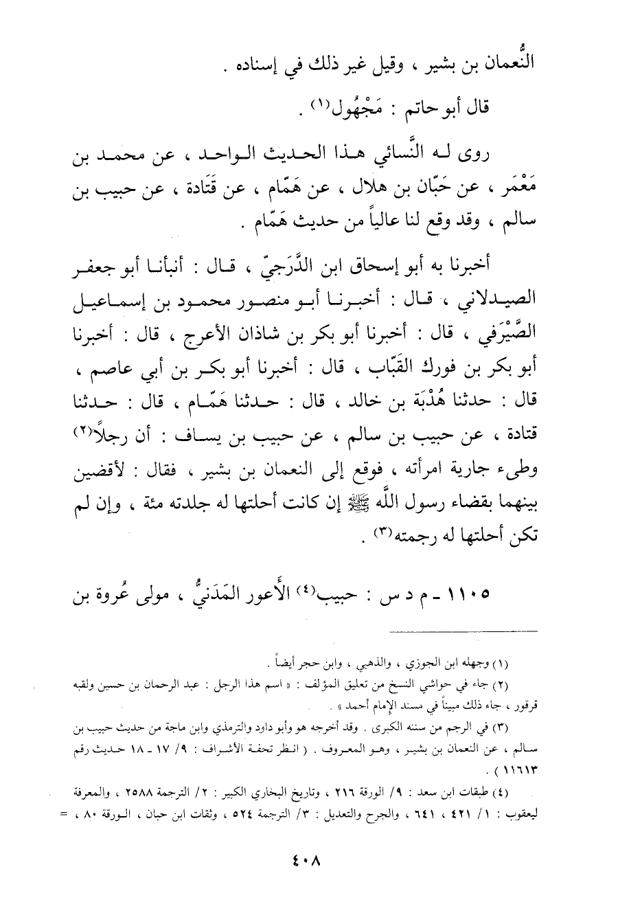 (3) في الرجم من سننه الكبرى. وقد أخرجه هو وأَبُو داود والتِّرْمِذِيّ وابن ماجه من حديث حبيب بْن سالم، عن النعمان بن بشير، وهو المعروف. (انظر تحفة الاشراف: 9 / 18 17 حديث رقم 11613) .