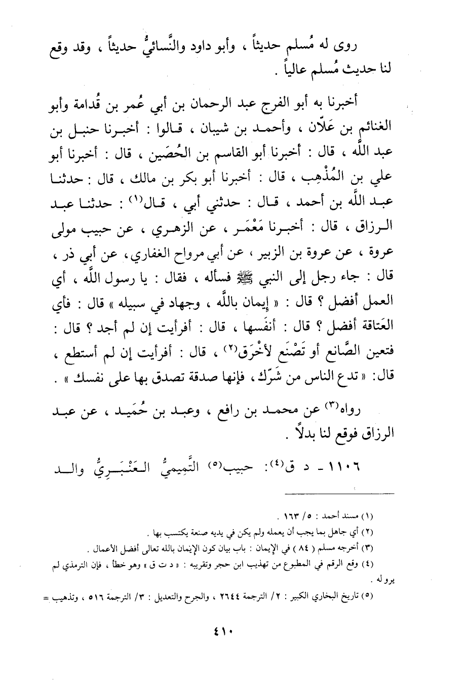 أَخْبَرَنَا بِهِ أَبُو الْفَرَجِ عَبْدُ الرَّحْمَنِ بْن أَبي عُمَر بْن قدامة وأبو الغنائم بْن علان، وأحمد بْنُ شَيْبَانَ، قَالُوا: أَخْبَرَنَا حَنْبَلُ بْن عَبد الله، قال: أَخْبَرَنَا أبو القاسم بْن الحصين، قال: أَخْبَرَنَا أبو علي بْن المذهب، قال: أَخْبَرَنَا أبو بكر بْن مالك، قال: حَدَّثَنَا عَبد الله بْن أَحْمَدَ، قال: حَدَّثني أبي، قال (1) : حَدَّثَنَا عَبْدُ الرَّزَّاقِ، قال: أَخْبَرَنَا مَعْمَرٌ، عَنِ الزُّهْرِيّ، عَنْ حَبِيبٍ مَوْلَى عُرْوَةَ، عَنْ عُرْوَةَ بْنِ الزُّبَيْرِ، عَن أَبِي مُرَوَاحٍ الْغِفَارِيِّ، عَن أَبِي ذَرٍّ، قال: جَاءَ رَجُلٌ إِلَى النَّبِيِّ صَلَّى اللَّهُ عَلَيْه وسَلَّمَ فَسَأَلَهُ، فَقَالَ: يَا رَسُولَ اللَّهِ، أَيُّ الْعَمَلِ أَفْضَلُ؟ قال: إِيمَانٌ بِاللَّهِ، وجِهَادٌ فِي سَبِيلِهِ"قال: فَأُيُّ الْعَتَاقَةِ أَفْضَلُ؟ قال: أَنْفَسُهَا، قال: أَفَرَأَيْتَ إِنْ لَمْ أَجِدْ؟ قال: فَتُعِينُ الصَّانِعَ أَوْ تَصْنَعُ لأَخْرَقَ (2) ، قال: أَفَرَأَيْتَ إِنْ لَمْ أَسْتَطِعْ، قال: تَدَعُ النَّاسَ مِنْ شَرِّكَ، فَإِنَّهَا صَدَقَةٌ تَصَدَّقُ بِهَا عَلَى نَفْسِكَ.