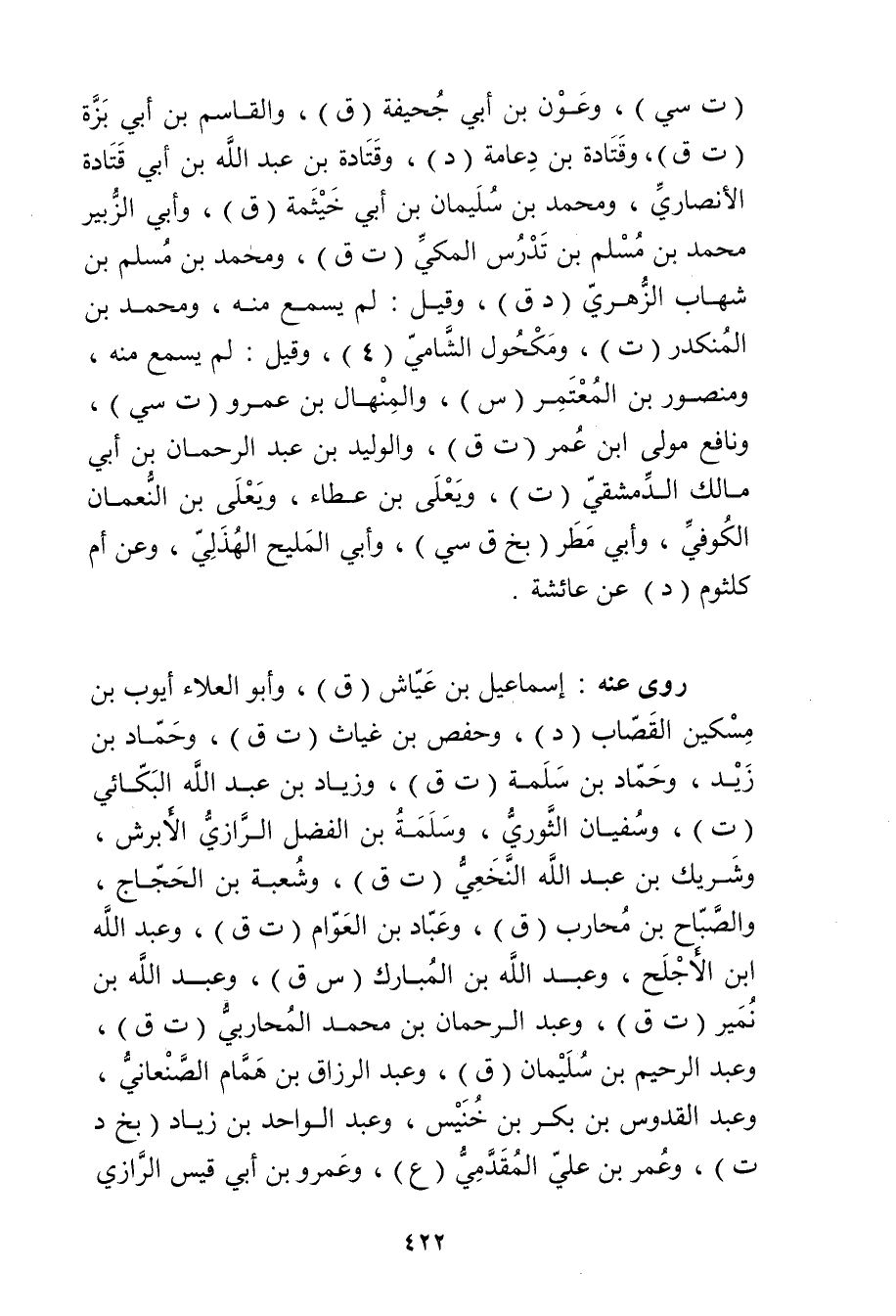 (ت سي) ، وعون بْن أَبي جحيفة (ق) ، والقاسم بْن أَبي بزة (ت ق) ، وقتادة بْن دعامة (د) ، وقتادة بْن عَبد الله بْن أَبي قتادة الأَنْصارِيّ، ومحمد بْن سُلَيْمان بْن أَبي حتمة (ق) ، وأبي الزبير مُحَمَّد بْن مسلم بْن تدرس المكي (ت ق) ، ومحمد بْن مسلم بْن شهاب الزُّهْرِيّ (د ق) ، وقيل: لم يسمع منه، ومحمد بْن المنكدر (ت) ، ومكحول الشامي (4) ، وقيل: لم يسمع منه، ومنصور بْن المعتمر (س) ، والمنهال بْن عَمْرو (ت سي) ، ونافع مولى ابْن عُمَر (ت ق) ، والوليد بْن عَبْد الرَّحْمَنِ بْن أَبي مالك الدمشقي (ت) ، ويَعْلَى بْن عطاء، ويَعْلَى بْن النعمان الكوفي، وأبي مطر (بخ ق سي) ، وأبي المليح الهذلي، وعن أم كلثوم (د) عن عائشة.