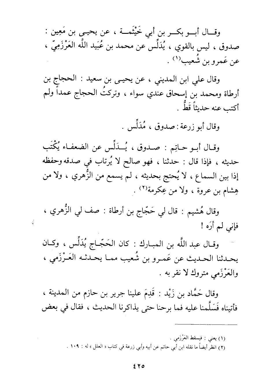 (2) انظر أيضا ما نقله ابن أَبي حاتم عَن أبيه وأبي زرعة في كتاب"العلل"له: 109.