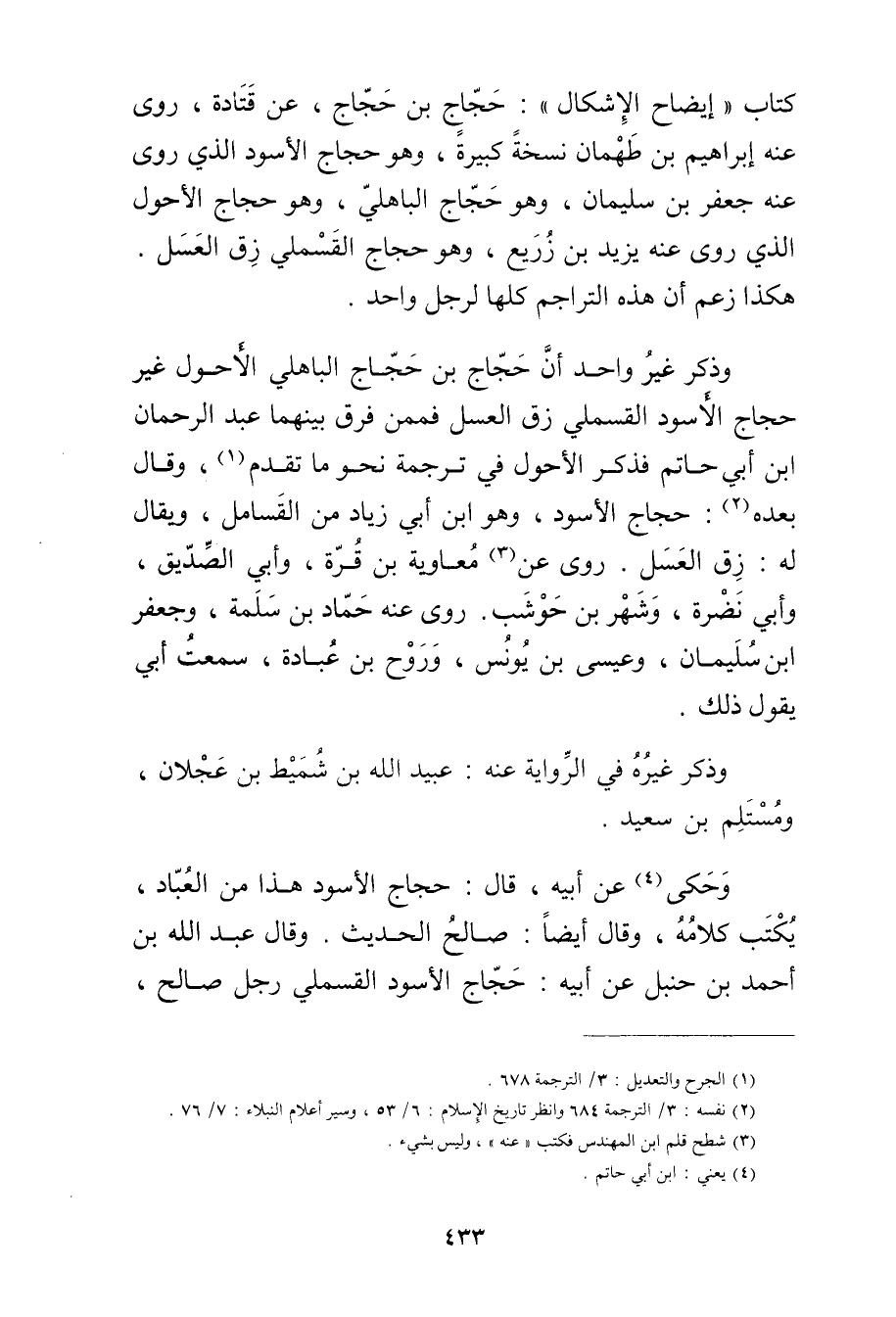 كتاب"إيضاح الإشكال": حجاج بْن حجاج، عن قتادة، روى عنه إبراهيم بْن طهمان نسخة كبيرة، وهو حجاج الأسود الذي روى عنه جعفر بْن سُلَيْمان، وهو حجاج الباهلي، وهو حجاج الأحول الذي روى عنه يزيد بْن زريع، وهو حجاج القسملي زق العسل. هكذا زعم أن هذه التراجم كلها لرجل واحد.