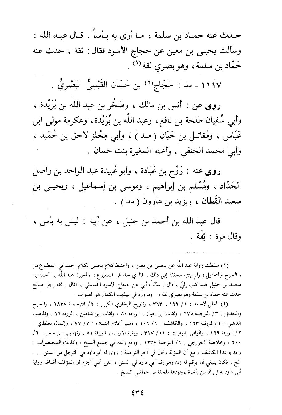 (1) سقطت رواية عَبد اللَّهِ عَنْ يَحْيَى بْن مَعِين، واختلط كلام يحيى بكلام أحمد في المطبوع من"الجرح والتعديل"ولم ينتبه محققه إلى ذلك، فالذي جاء في المطبوع: أَخْبَرَنَا عَبد اللَّهِ بْنُ أَحْمَدَ بن محمد بن حنبل فيما كتب إلي، قال: سَأَلتُ أَبِي عن حجاج الأسود القسملي، فقال: ثقة رجل صالح حدث عنه حماد بْن سلمة وهو بصري ثقة". وما ورد في تهذيب الكمال هو الصواب.