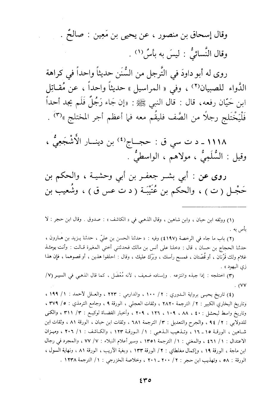 (4) تاريخ يحيى برواية الدوري: 2 / 100، والدارمي: 223، والعلل لأحمد: 1 / 199، وتاريخ البخاري الكبير: 2 / الترجمة 2820، وثقات العجلي، الورقة 9، وجامع التِّرْمِذِيّ: 5 / 379، وتاريخ واسط لبحشل: 40، 109 88، 126، 209، وأخبار القضاة لوكيع: 3 / 311، والكنى للدولابي: 2 / 94، والجرح والتعديل: 3 / الترجمة 681، وثقات ابن حبان، الورقة 81، وثقات ابن شاهين، الورقة 16 15، وتذهيب الذهبي: 1 / الورقة 123، والكاشف: 1 / 206، وميزان الاعتدال: 1 / 461، والمغني: 1 / الترجمة 1351، وسير أعلام النبلاء: 7 / 77، والمجرد في رجال ابن ماجة، الورقة 19، وإكمال مغلطاي: 2 / الورقة 133، وبغية الاريب، الورقة 81، ونهاية السول، الورقة: 58، وتهذيب ابن حجر: 2 / 201 200، وخلاصة الخزرجي: 1 / الترجمة 1238.
