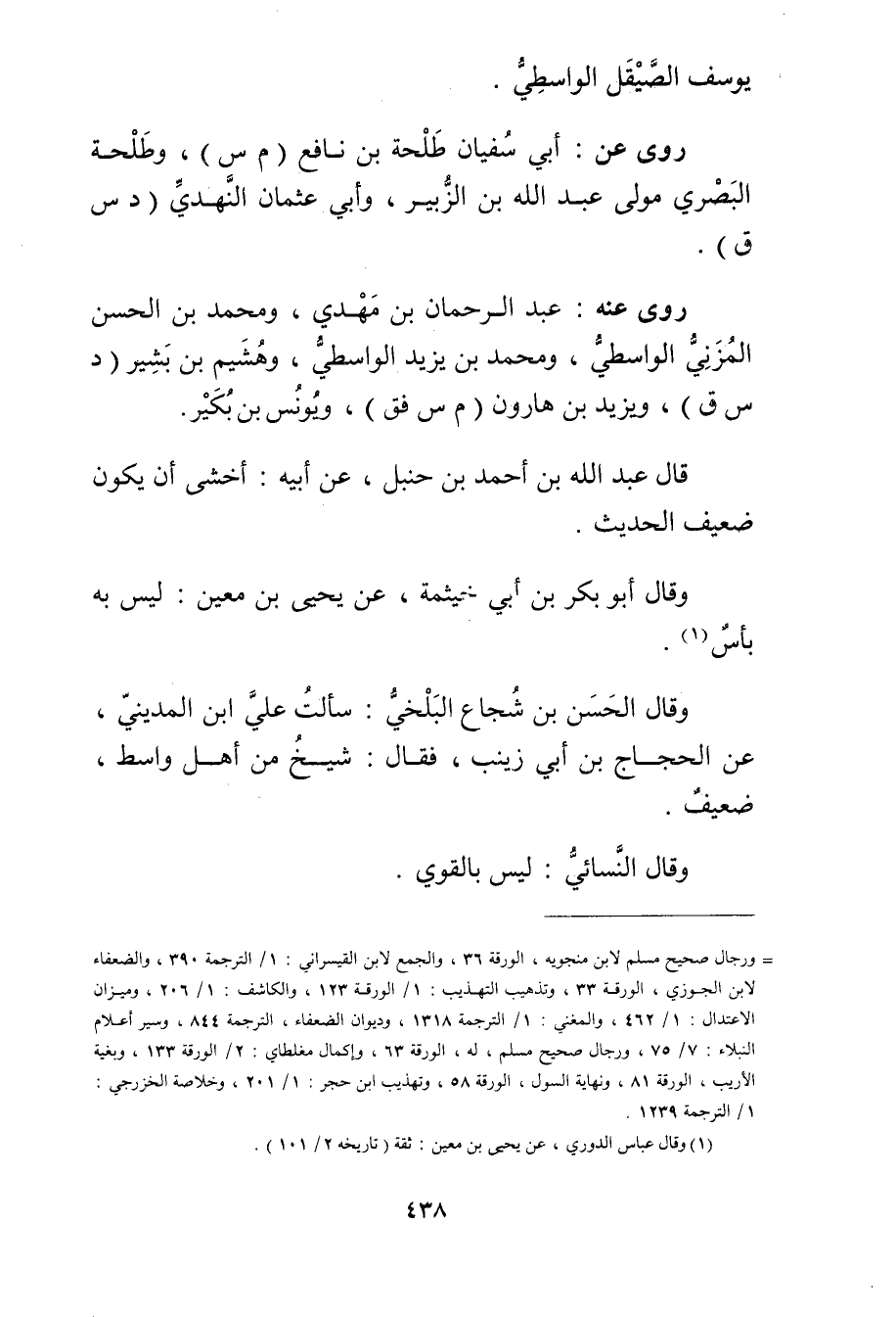 = ورجال صحيح مسلم لابن منجويه، الورقة 36، والجمع لابن القيسراني: 1 / الترجمة 390، والضعفاء لابن الجوزي، الورقة 33، وتذهيب التهذيب: 1 / الورقة 123، والكاشف: 1 / 206، وميزان الاعتدال: 1 / 462، والمغني:! / الترجمة 1318، وديوان الضعفاء، الترجمة 844، وسير أعلام النبلاء: 7 / 75، ورجال صحيح مسلم، له، الورقة 63، وإكمال مغلطاي: 2 / الورقة 133، وبغية الاريب، الورقة 81، ونهاية السول، الورقة 58، وتهذيب ابن حجر: 1 / 201، وخلاصة الخزرجي: 1 / الترجمة 1239.