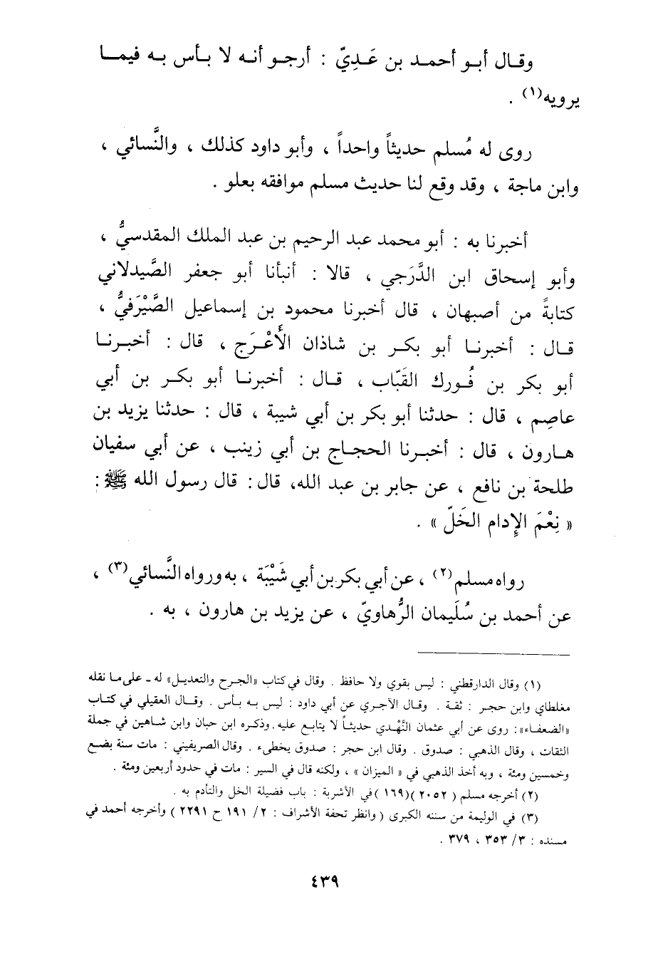 أَخْبَرَنَا بِهِ: أَبُو مُحَمَّدٍ عَبد الرَّحِيمِ بْنُ عَبد المَلِك الْمَقْدِسِيُّ، وأبو إسحاق ابن الدَّرَجِيِّ، قَالا: أَنْبَأَنَا أَبُو جَعْفَرٍ الصَّيْدَلانِيُّ كِتَابَةً مِنْ أَصْبَهَانَ، قال أَخْبَرَنَا مَحْمُودُ بْنُ إِسْمَاعِيلَ الصَّيْرَفِيُّ، قال: أَخْبَرَنَا أبو بكر بْن شَاذَانَ الأَعْرَجُ، قال: أَخْبَرَنَا أَبُو بَكْرِ بْنُ فُوُرَكَ الْقَبَّابُ، قال: أَخْبَرَنَا أَبُو بَكْرِ بْنُ أَبي عَاصِمٍ، قال: حَدَّثَنَا أَبُو بَكْرِ بْنُ أَبي شَيْبَة، قال: حَدَّثَنَا يزيد بْن هارون، قال: أخبرنا الْحَجَّاجُ بْنُ أَبي زَيْنَبَ، عَن أبي سفيان طلحة بْن نافع، عَنْ جَابِرِ بْنِ عَبد اللَّهِ، قال: قال رَسُولُ اللَّهِ صلى اللَّهُ عَلَيْه وسَلَّمَ: نِعْمَ الإِدَامُ الْخَلُّ.