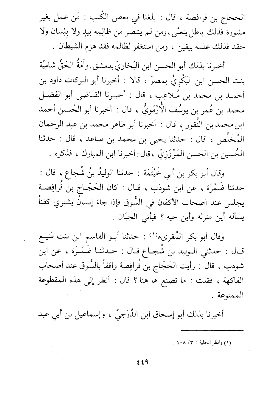 وَقَال أَبُو بكر المقرئ (1) : حَدَّثَنَا أَبُو الْقَاسِمِ ابْن بنت منيع قال: حَدَّثَنِي الوليد بْن شجاع قال: حَدَّثَنَا ضمرة، عن ابن شوذب، قال: رأيت الحجاج بْن فرافصة واقفا بالسوق عند أصحاب الفاكهة، فقلت: ما تصنع ها هنا؟ قال: أنظر إلى هذه المقطوعة الممنوعة.